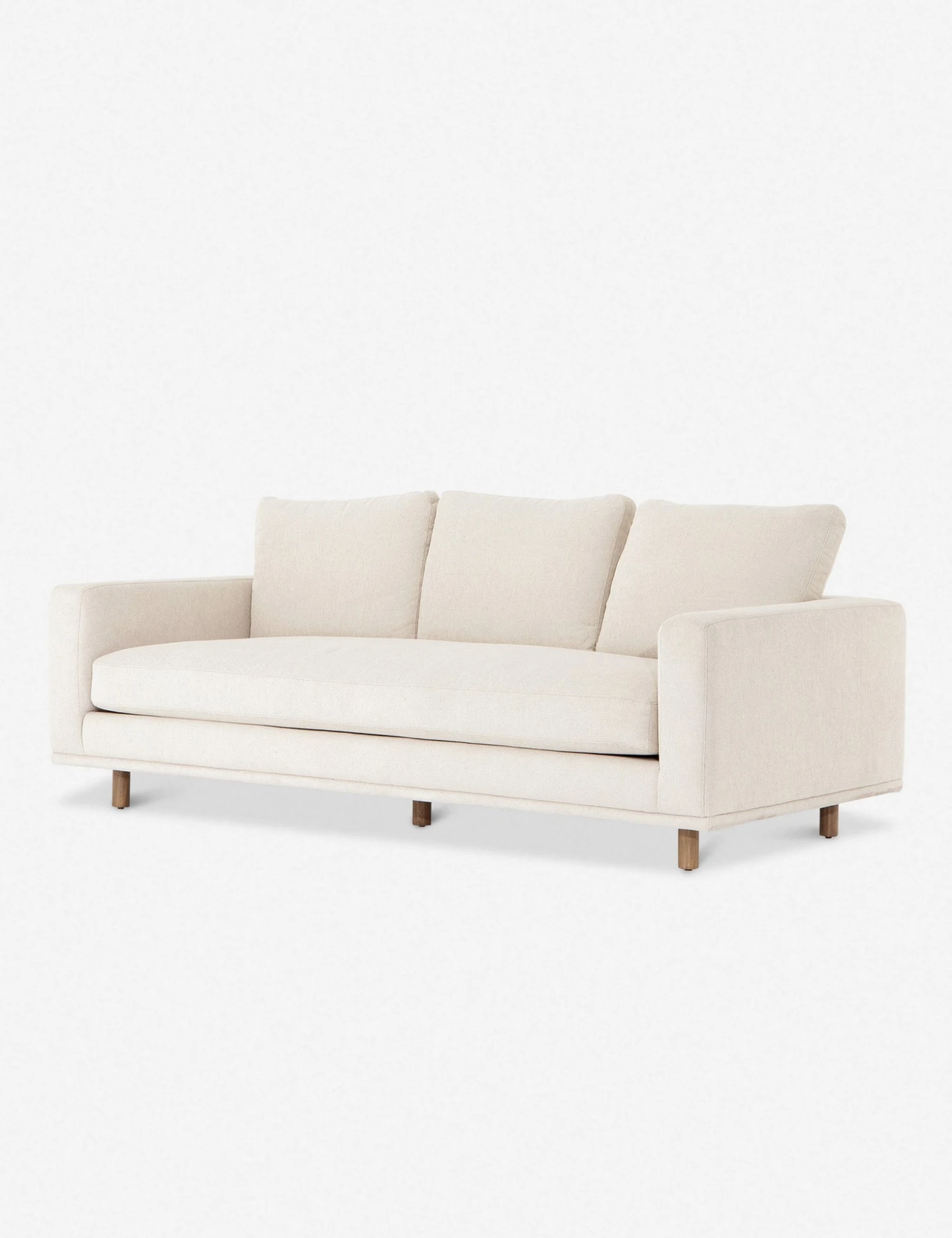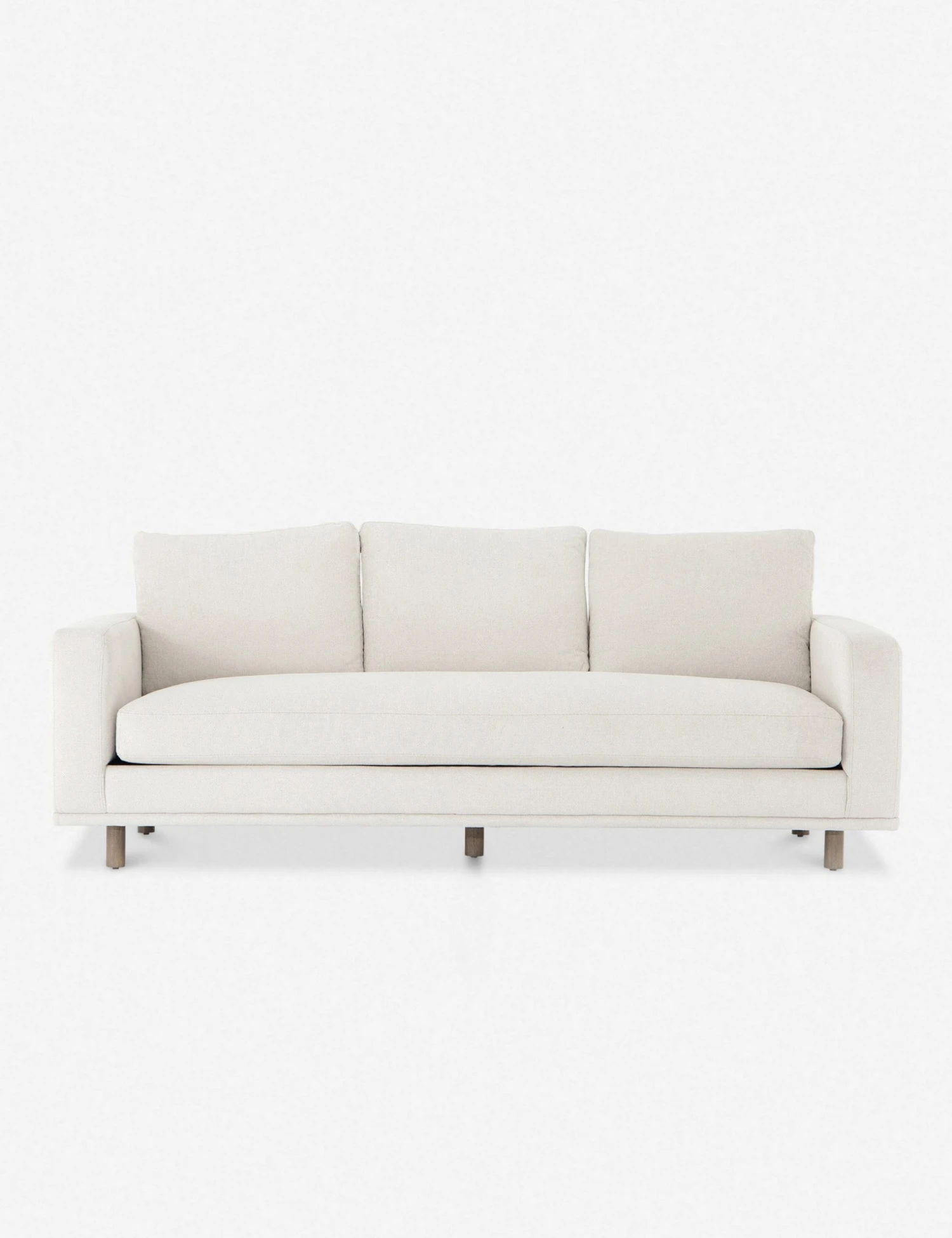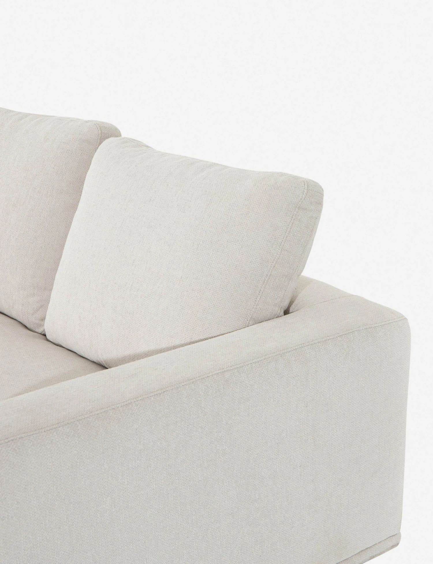 This sofa pairs light neutral upholstery with a statement-making silhouette to provide a tailored touch for a curated space. Clean-lined arms lend this living room sofa a sleek look, while the feather-blend cushioning and performance fabric offer an inviting place to land. Finish the aesthetic with sculptural accents and artistic decor for a refined feel.