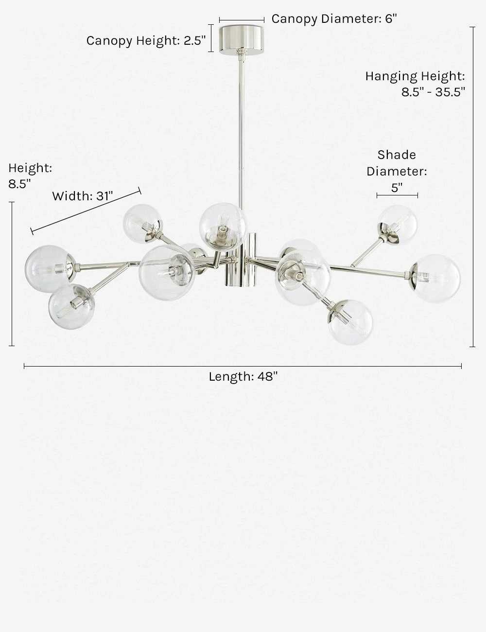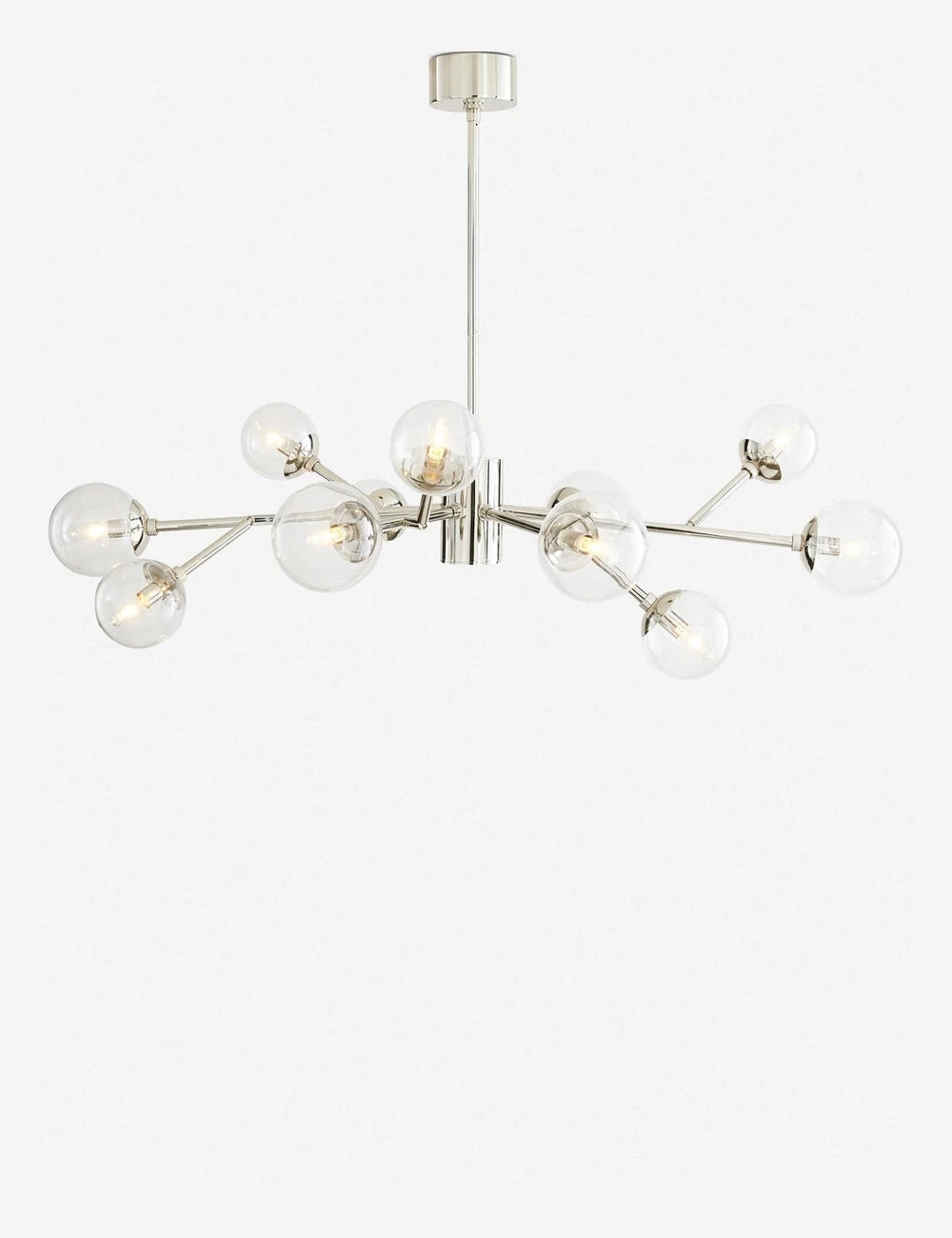 An extended profile and twelve angular arms make this chandelier perfect for a grand lighting statement over a dining room table or open-plan living space. The steel body and glass globes come together in a bright and polished modern chandelier design that will transform your space with a brilliant pool of light.