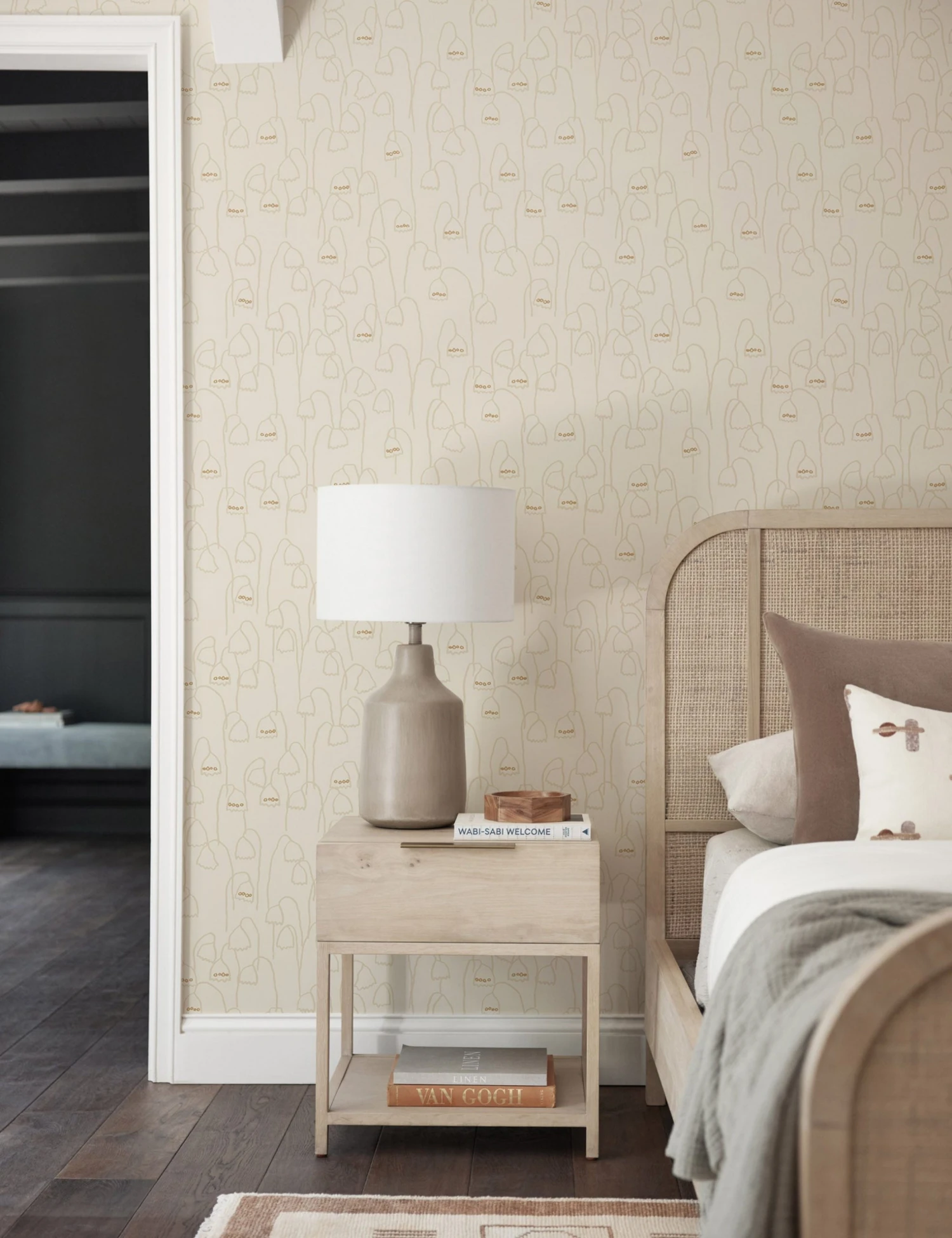 Artist Susan Hable’s experience in collage, sculpture, welding, drawing, and printmaking informs her uniquely inspired collection. A floral wallpaper that will wrap a room in effortless style. This subtle design of line-drawn flowers with gold accents throughout is a perfect touch of charm to finish an airy, modern living space with a sleek paper wall motif.