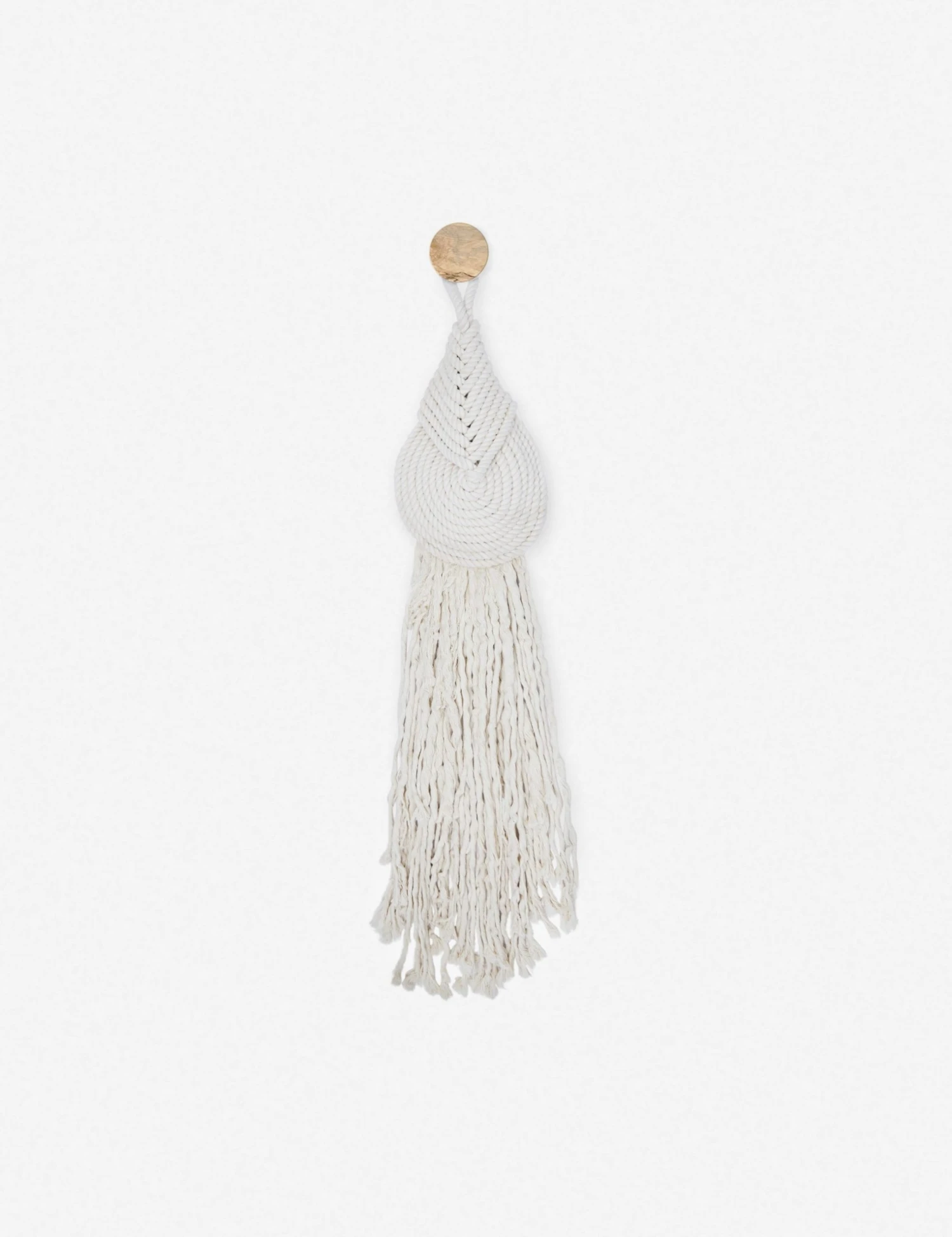 Based in Cedar Rapids, Iowa, designer Candice Luter creates one-of-a-kind wall art using reclaimed wood and textiles. This fiber art for walls is woven from soft cotton rope into an abstract design, dip-dyed in an earthy neutral tone, and then paired with a spalted maple accent knob to hang onto the wall. With its narrower design, it is perfect for an entryway or transitional spaces.