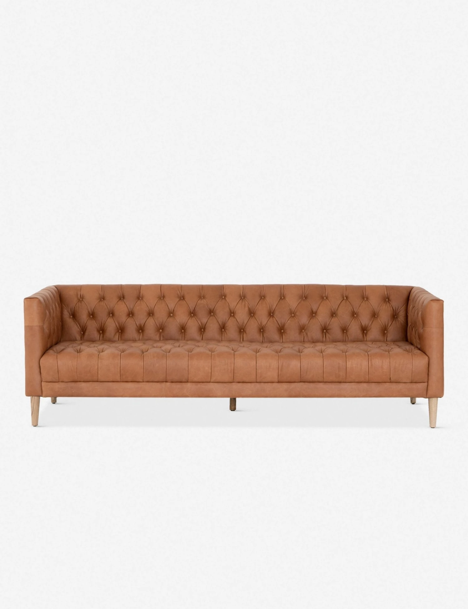 Take a seat with the Breanne Leather Sofa. Characterized by detailed allover tufting, this gorgeous soft washed camel sofa has a stylish yet inviting feel. Finished with tapered wooden legs.