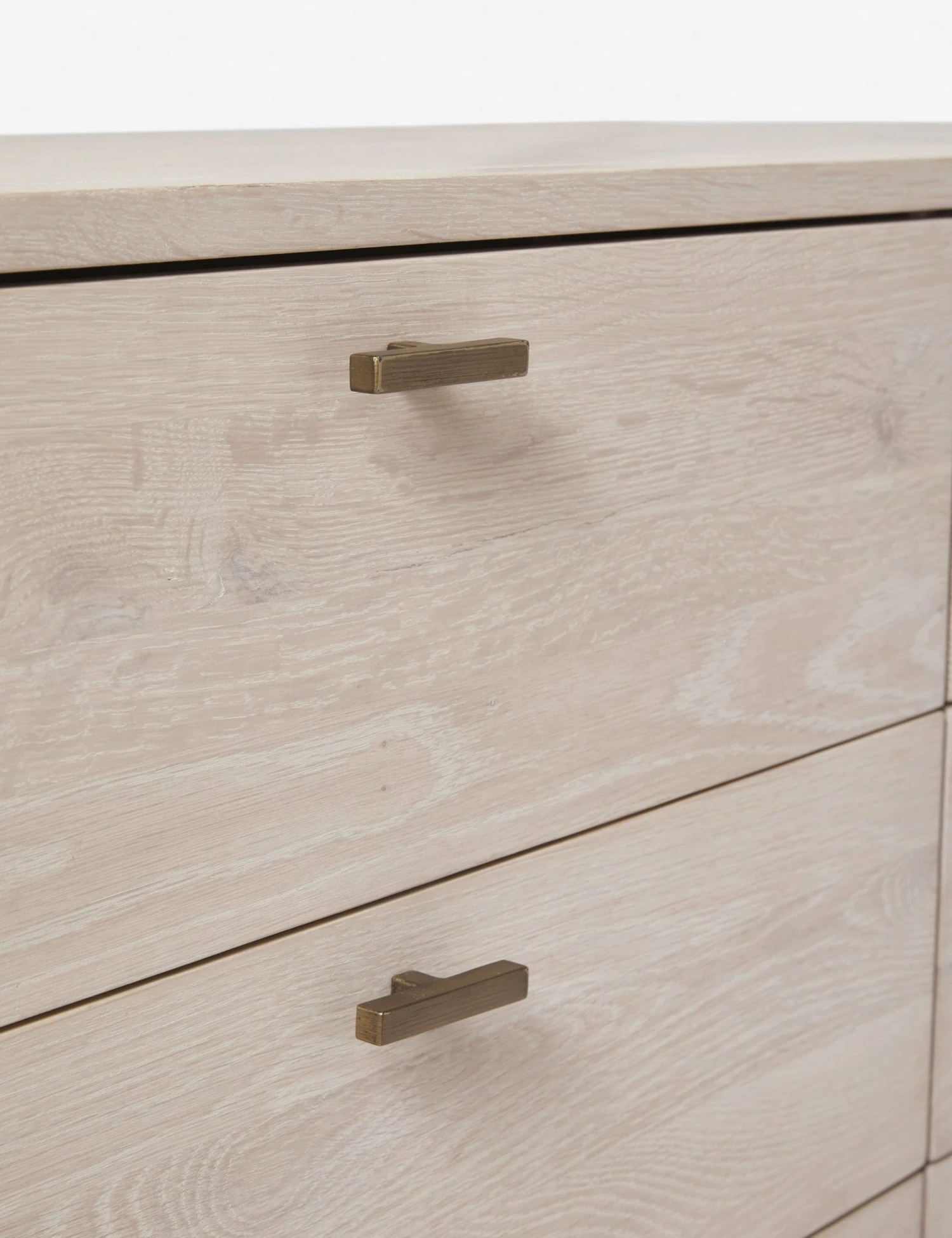 The whitewashed finish of this dresser warmly compliments the arched corners of its understated design. It is fitted with sleek iron pulls and six roomy drawers to offer storage and style in equal measure. Pair this oak wood dresser with a cozy rug and sculptural accents for textural contrast.
