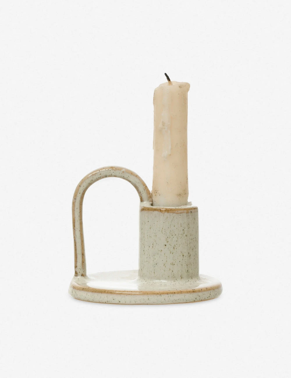 Bring a timeless ceramic charm to your mantle or tablescape with this handled taper candle holder. The reactive glaze features a speckled detail with browned edges for a tone tailored to farmhouse chic.