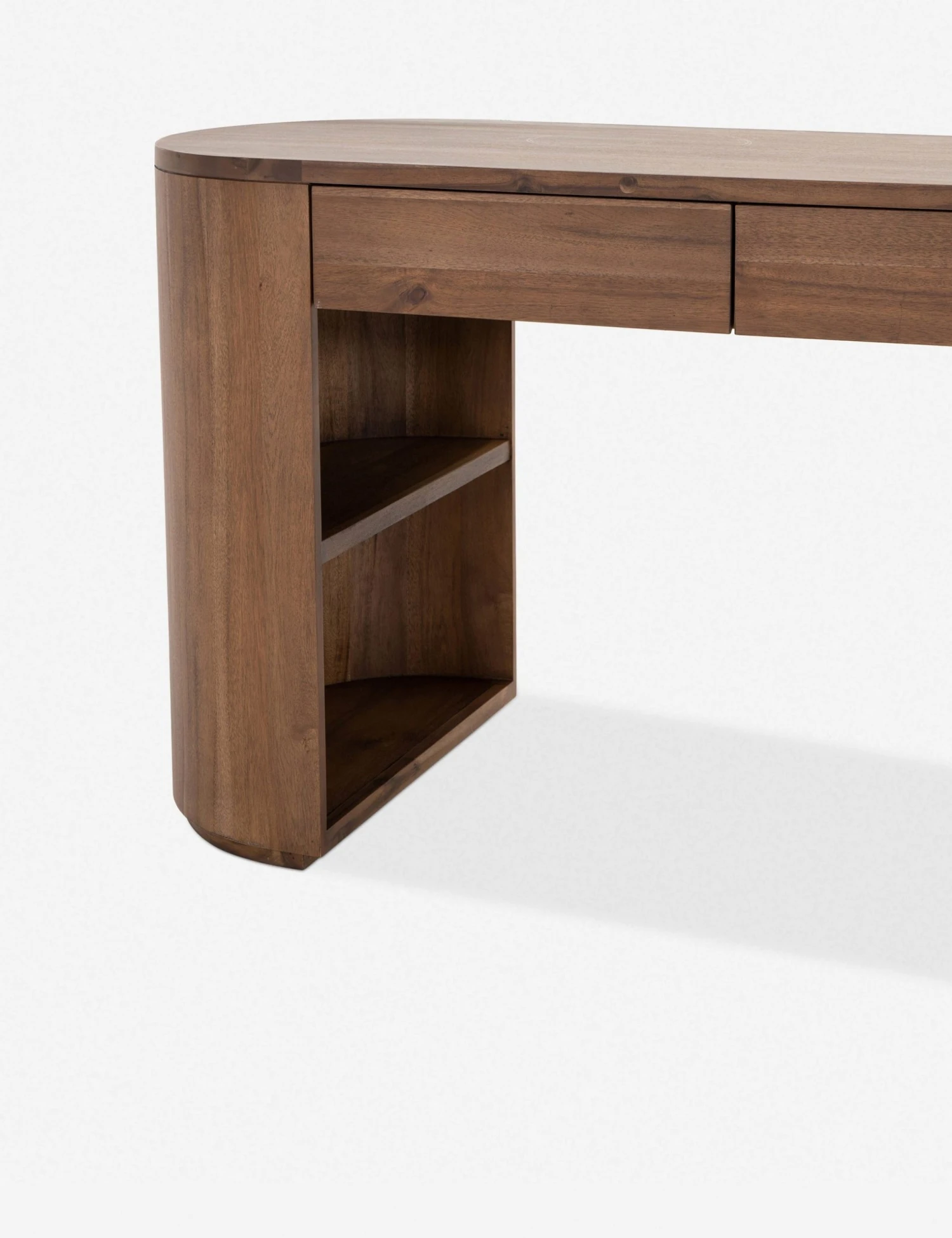 This pill-shaped wooden desk brings a stately look with a slightly retro feel to your office. The simple silhouette features hidden storage shelves in the half-cylinder legs and two convenient drawers.