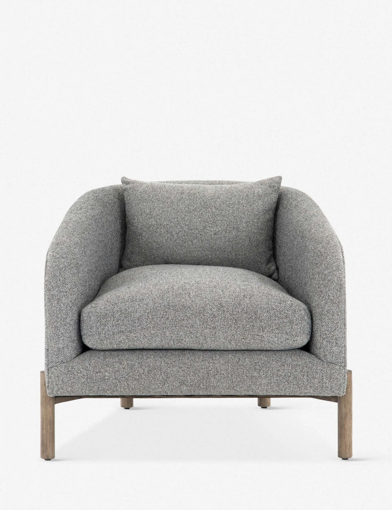 This accent chair is a billowy, modern update on traditional barrel seating with its oak wood dowel base, cozy back cushion, and tweed-like upholstery. Wrapped in a textured fabric, with interwoven black, white, and gray yarns creating a striking heathered effect. Place this occasional chair in your living room, bedroom, or home office.