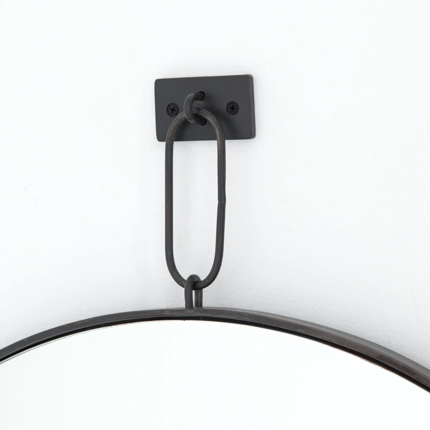 This circular mirror hangs from a special clasp, giving it a more industrial feel. Mix with exposed brick and natural woods to complete the look.