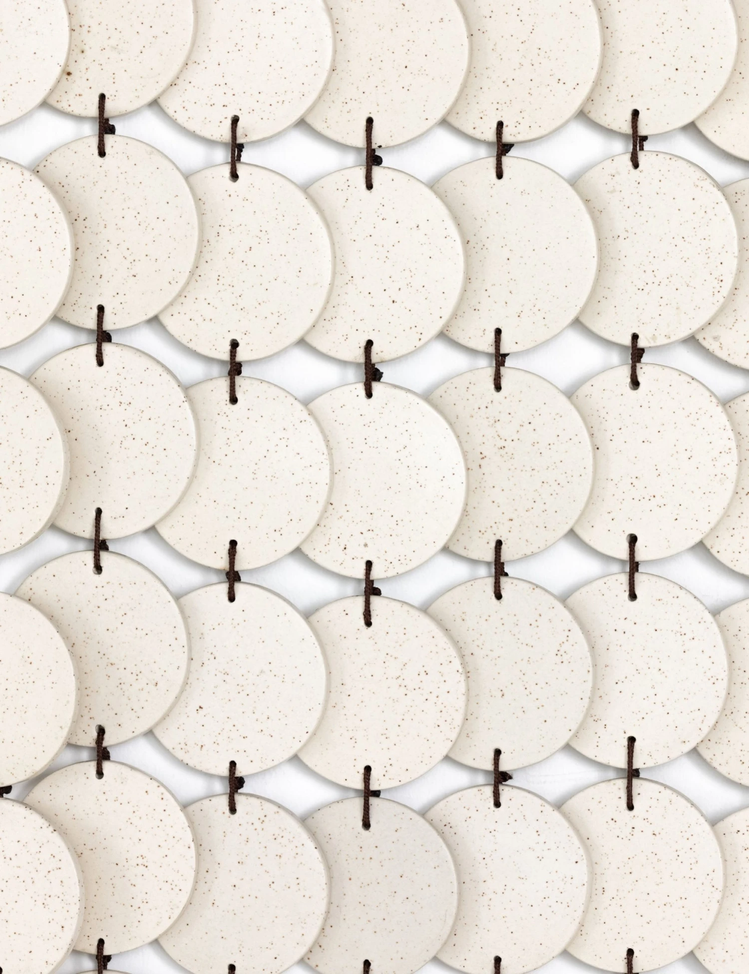 Simple elements are fashioned into a textural piece of wall art in this artisanal feature. A pleasing arrangement of layered cream ceramic disks hang from a slim black frame to offer a tactile dimension for a collected décor. Style this wall hanging with sculptural accents and natural woods for a laid-back, transitional space.