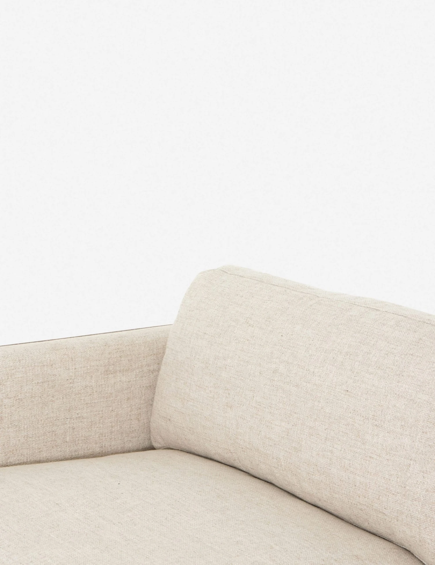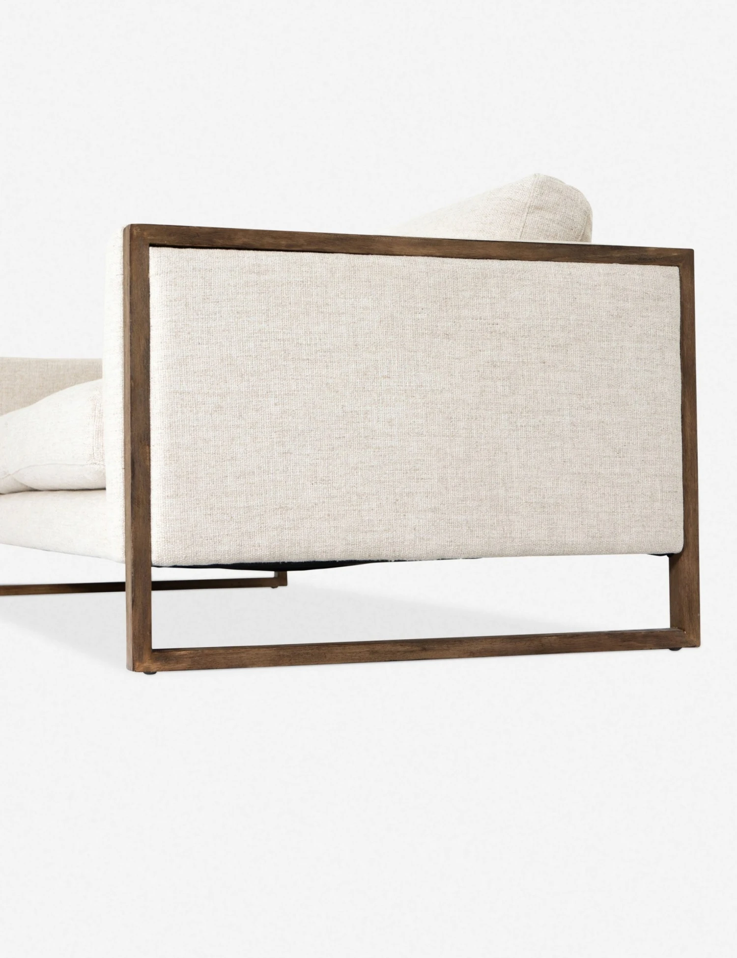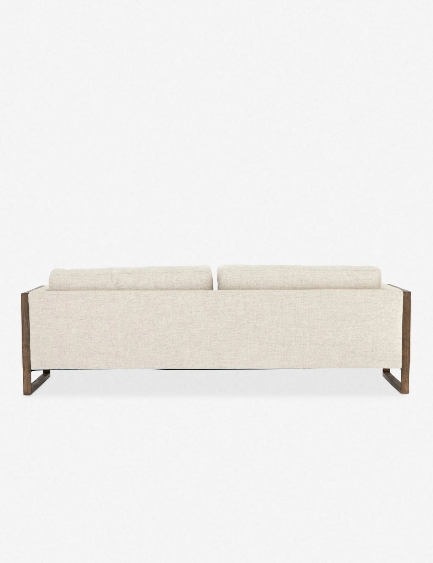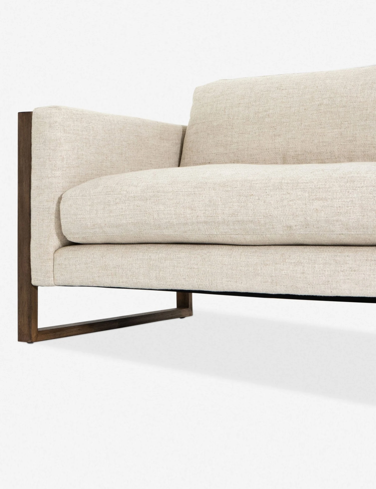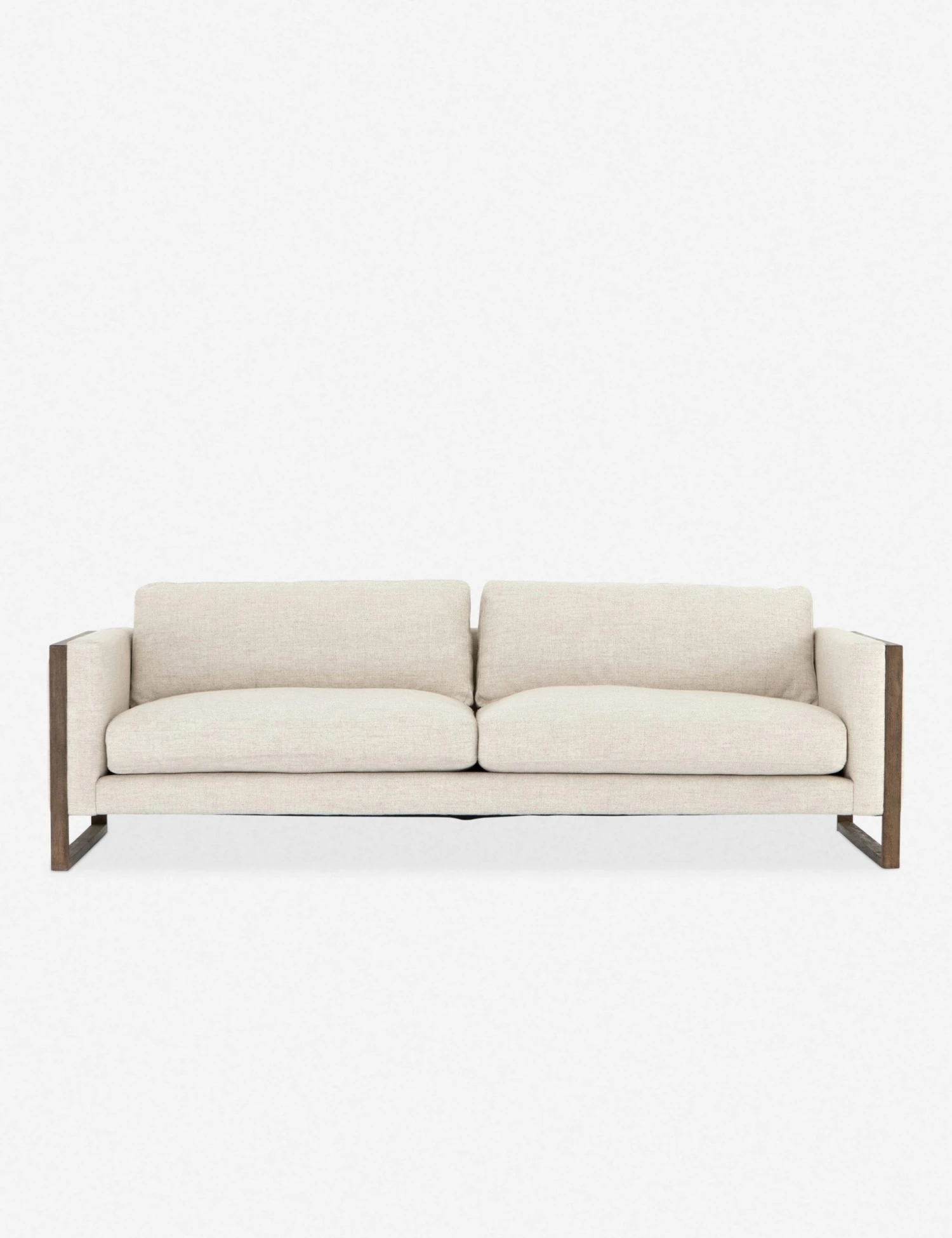 A transitional sofa that easily goes contemporary. With a versatile cream upholstery, cozy cushions, and a cutout, exposed wood frame, it perfectly combines minimalistic tendencies with an inviting, homey aesthetic.