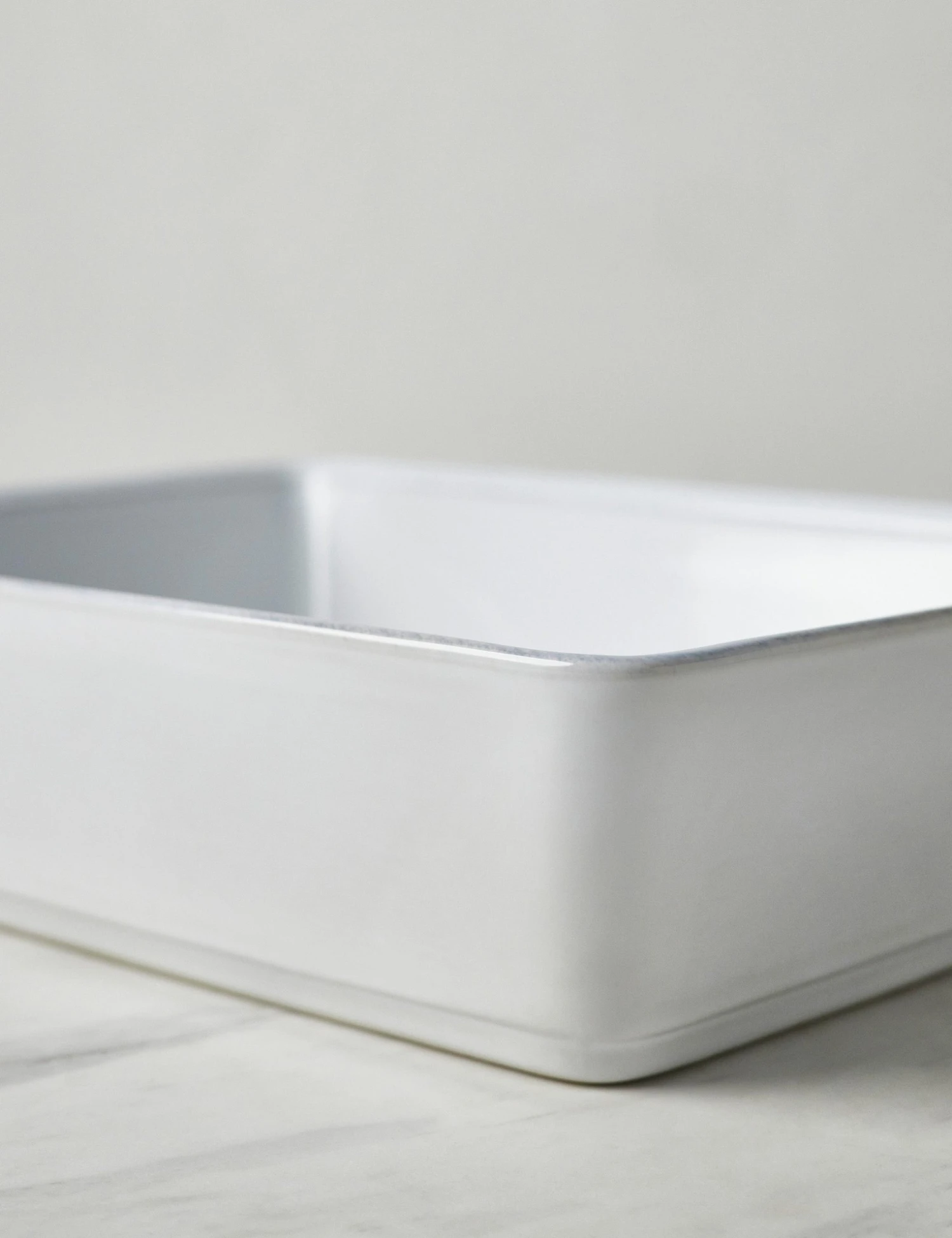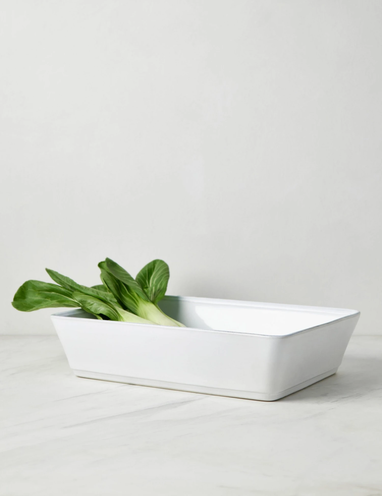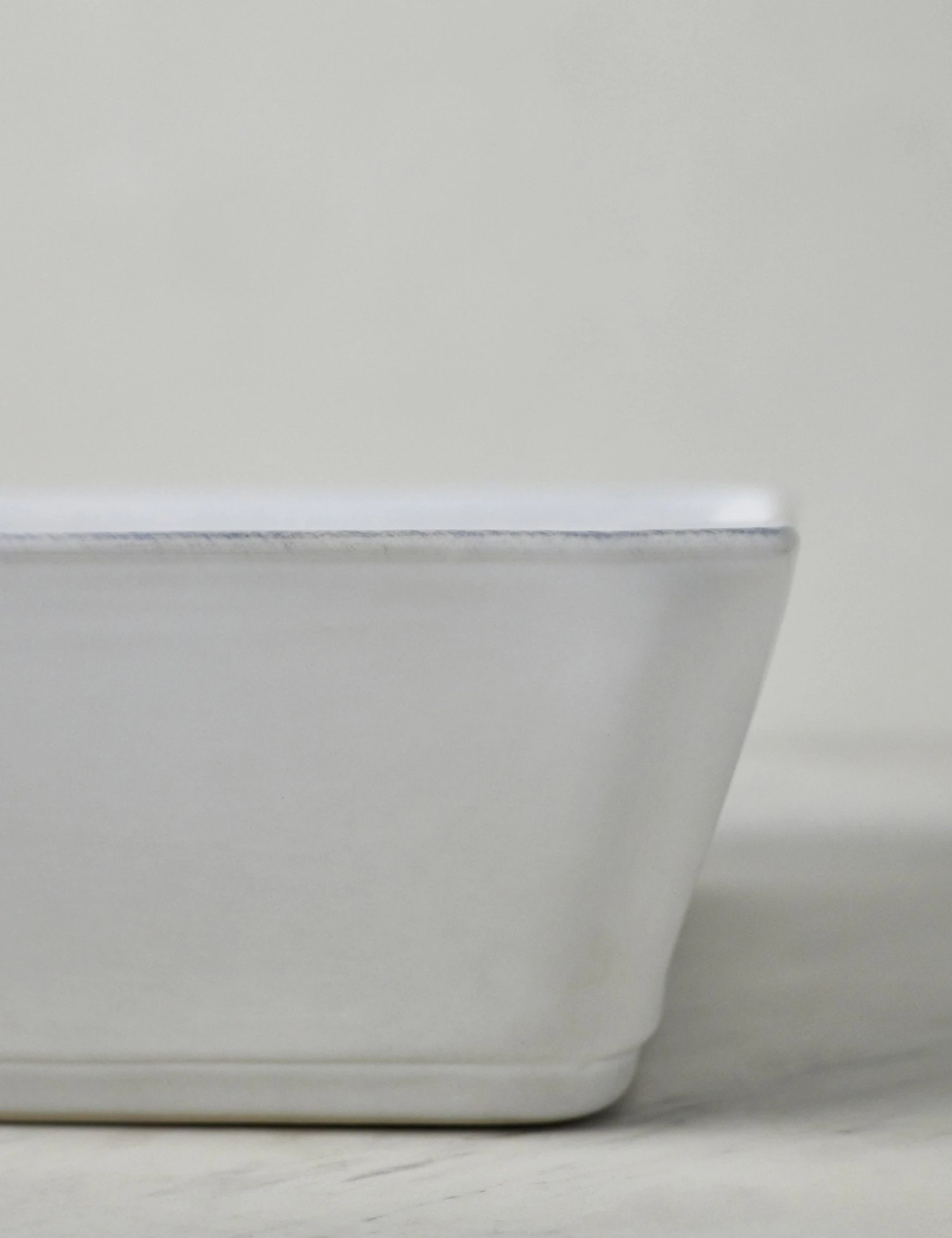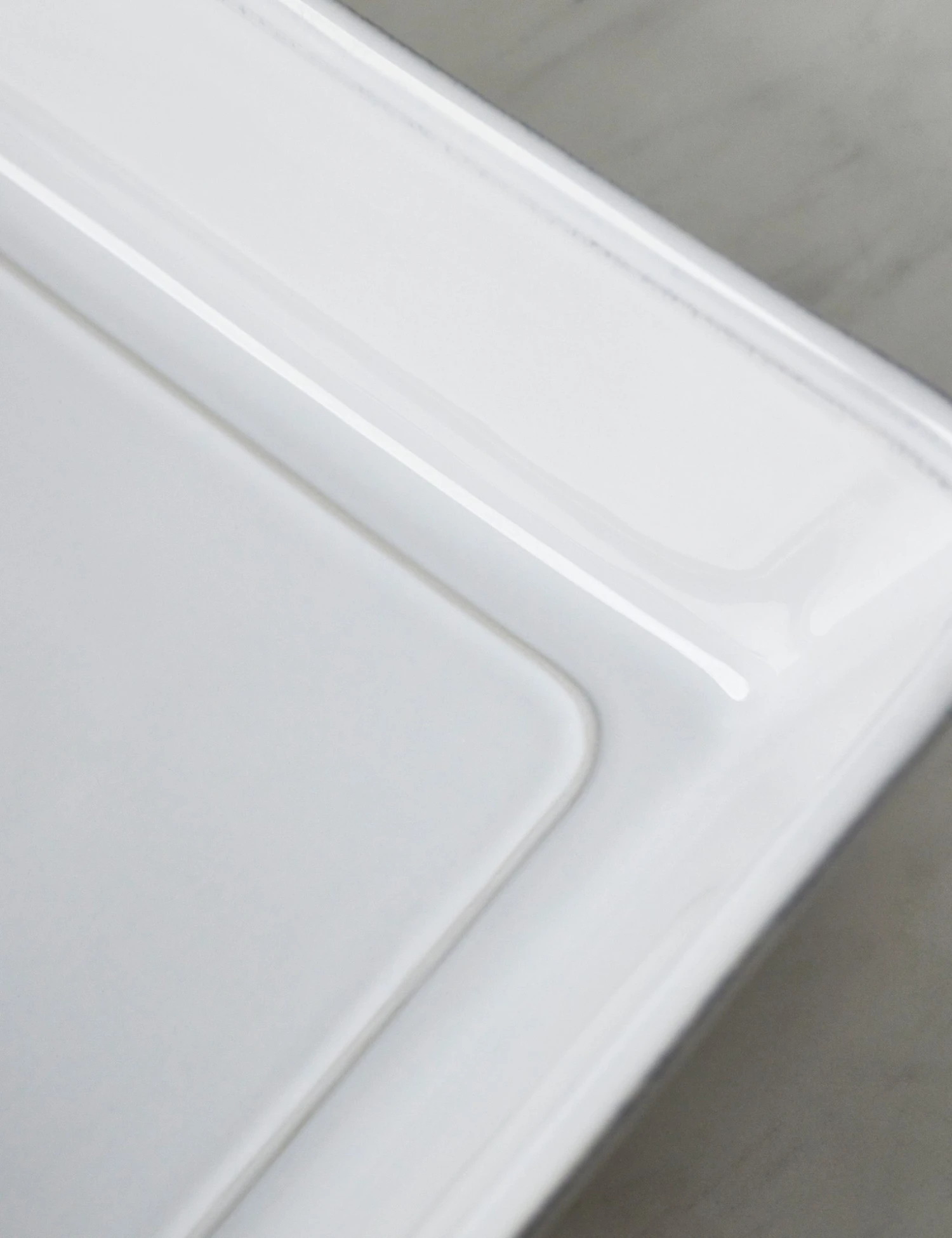 Refined lines, versatile design, and durable stoneware construction make the Friso dinnerware collection a favorite, from fine dining to everyday eating. The grooved edge is hand-painted for an artisanal touch that will fit perfectly into your carefully curated home decor. In a crisp white finish, this baking dish is an elegant and handy kitchen accessory.