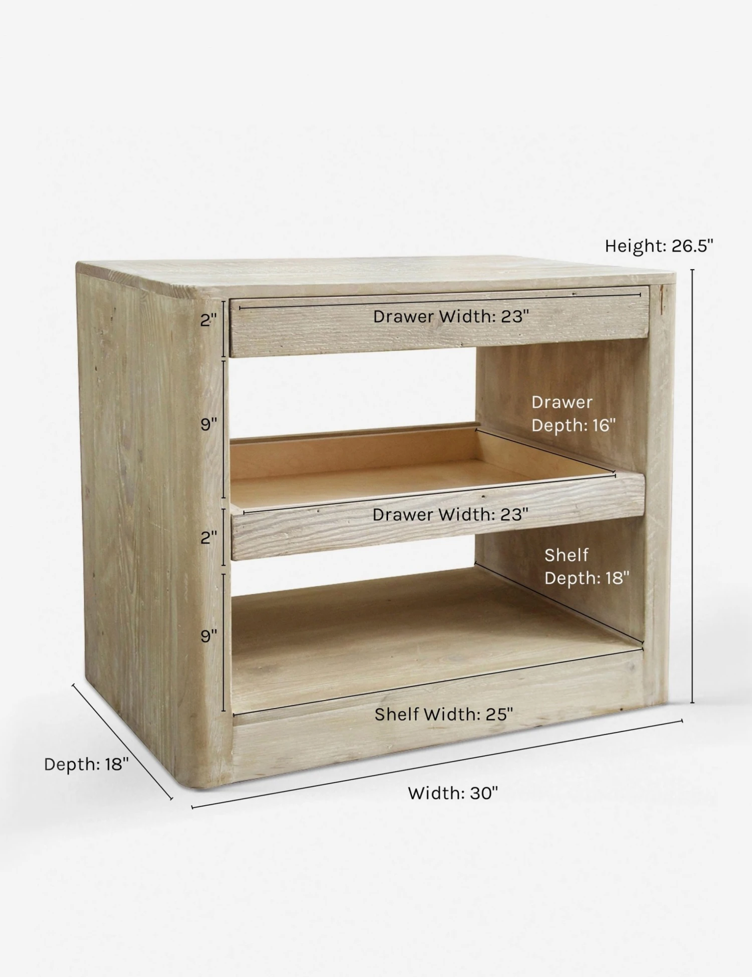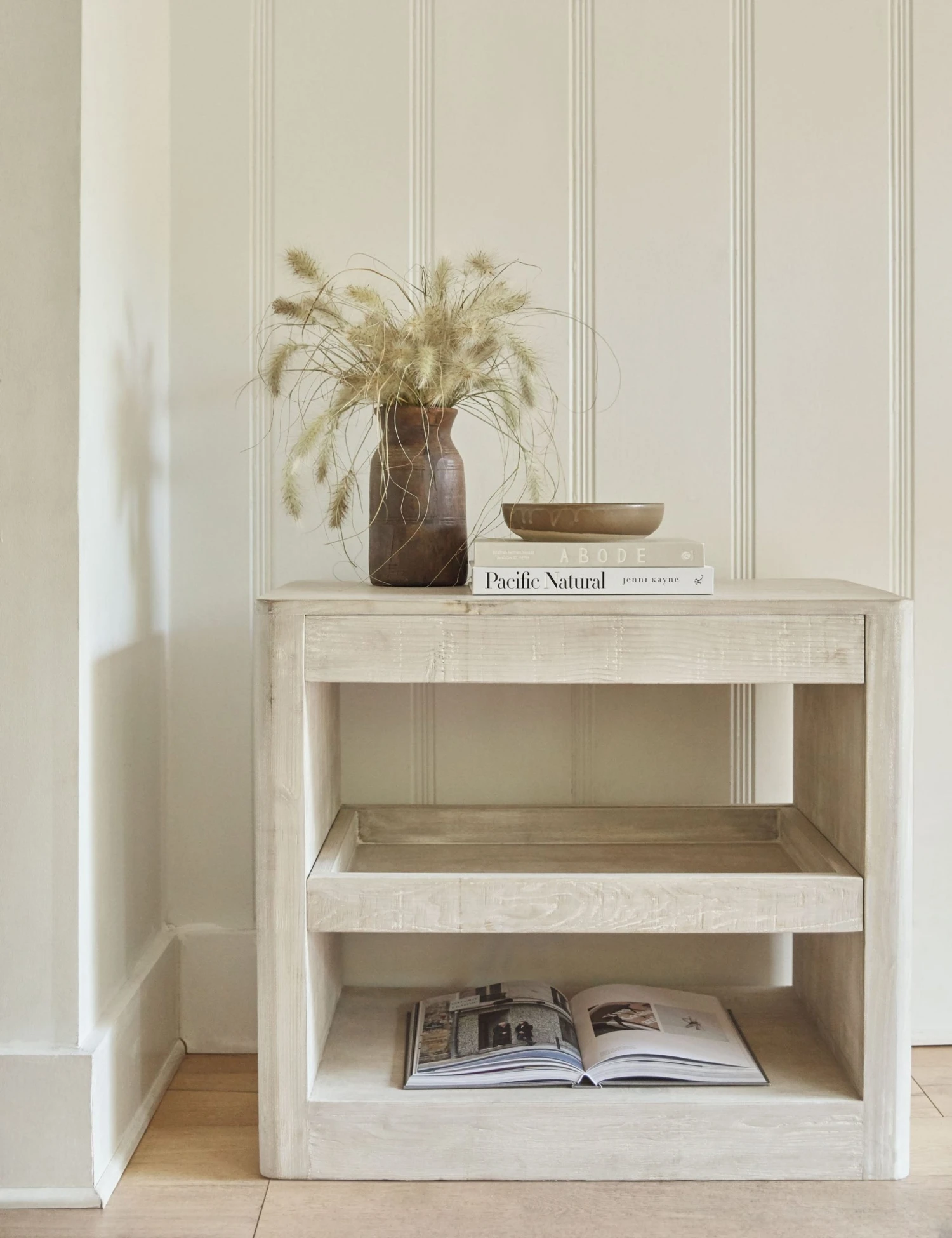 Scandinavian form and function really shine through in our Arabel Nightstand. Two open shelves and a slim drawer save space without sacrificing style—and in a whitewashed finish, we love it with a pastel color palette and other modern pieces.