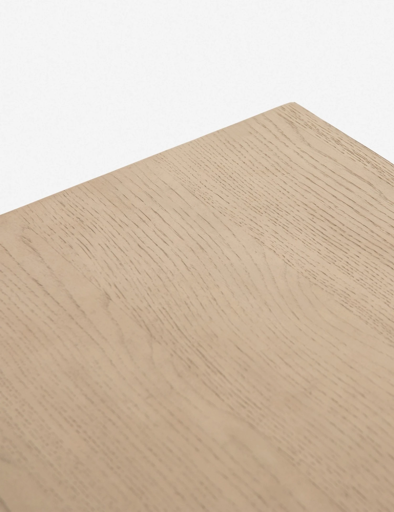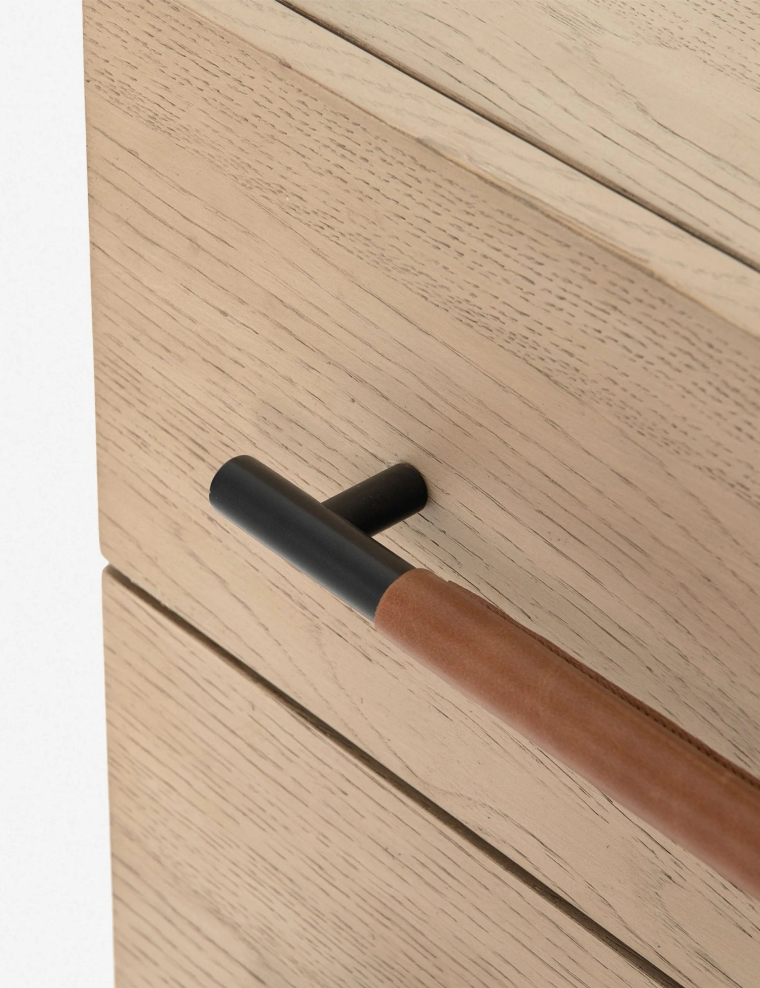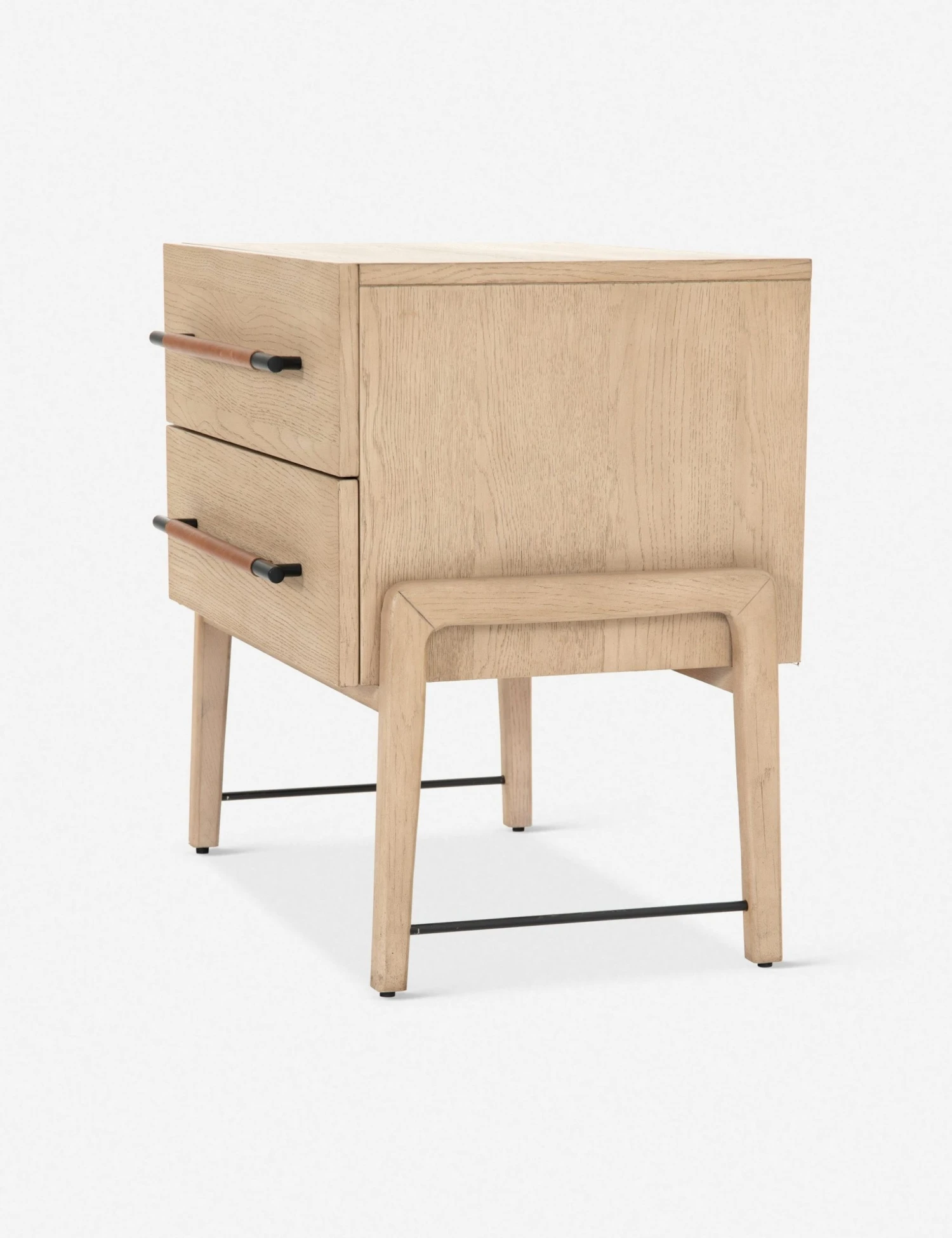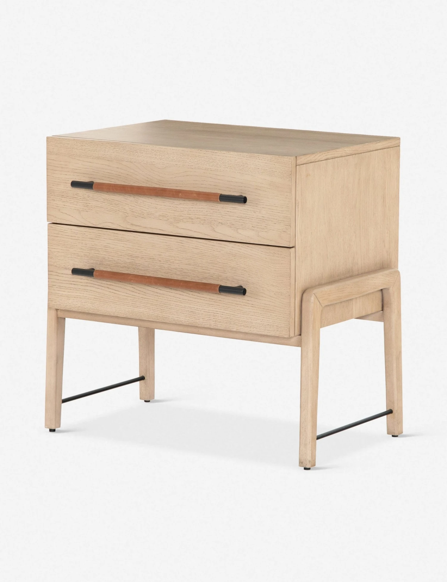 With its clean lines, sandy finish, and leather accents, this nightstand brings a refined, minimalist effect to your bedroom. Constructed from solid oak and an oak veneer, it’s complemented by iron hardware and wrapped in tan top-grain leather. Two roomy drawers provide a bit of extra storage space.