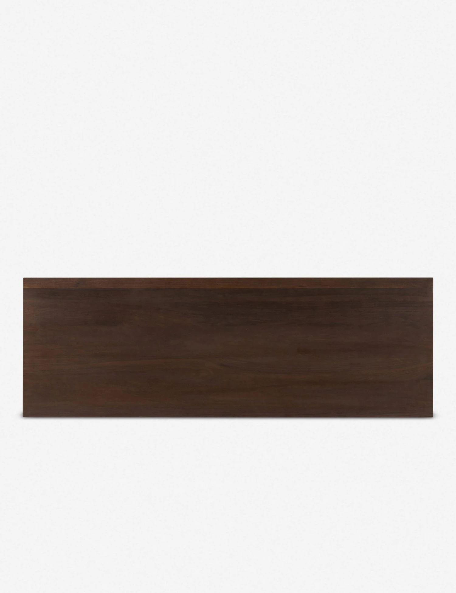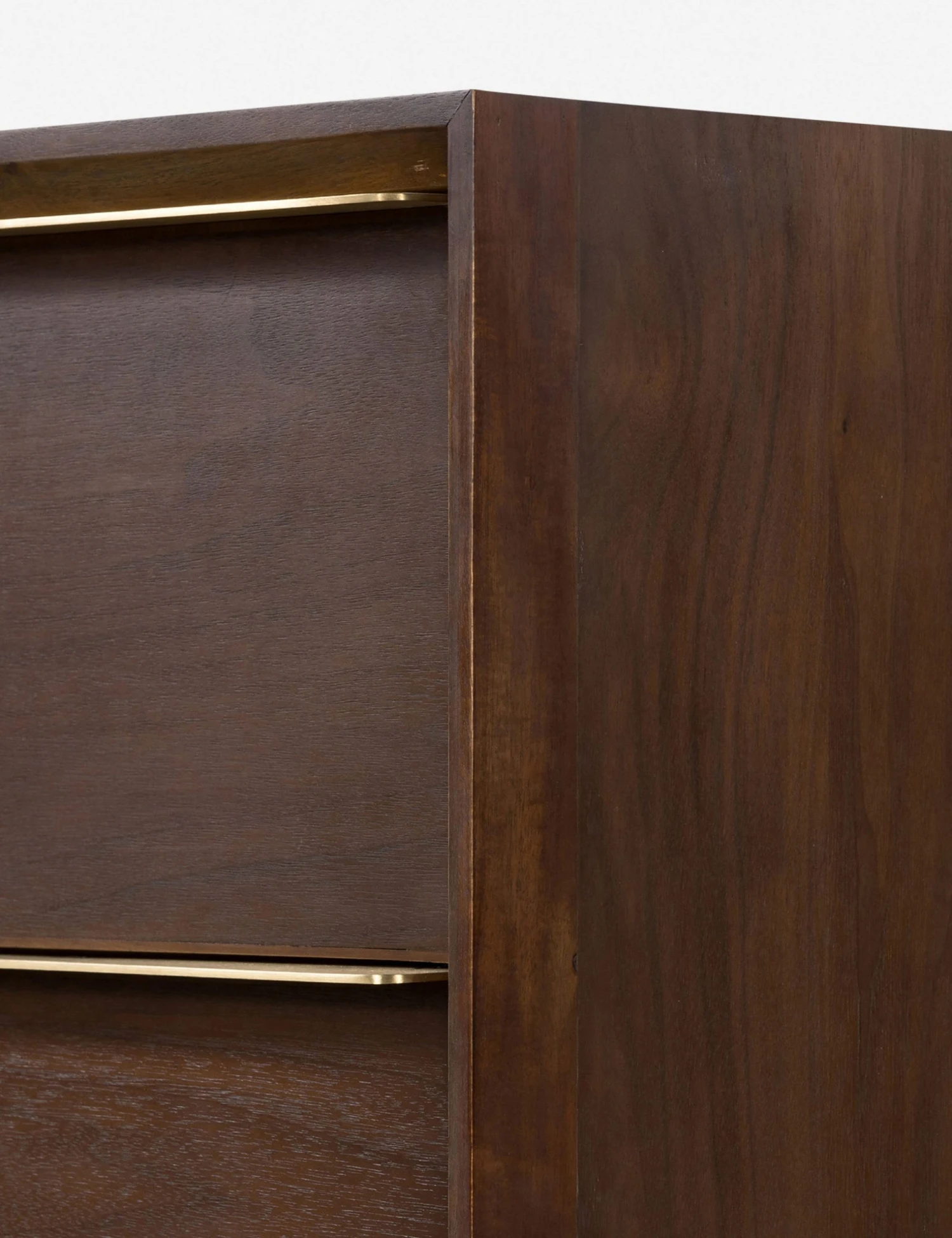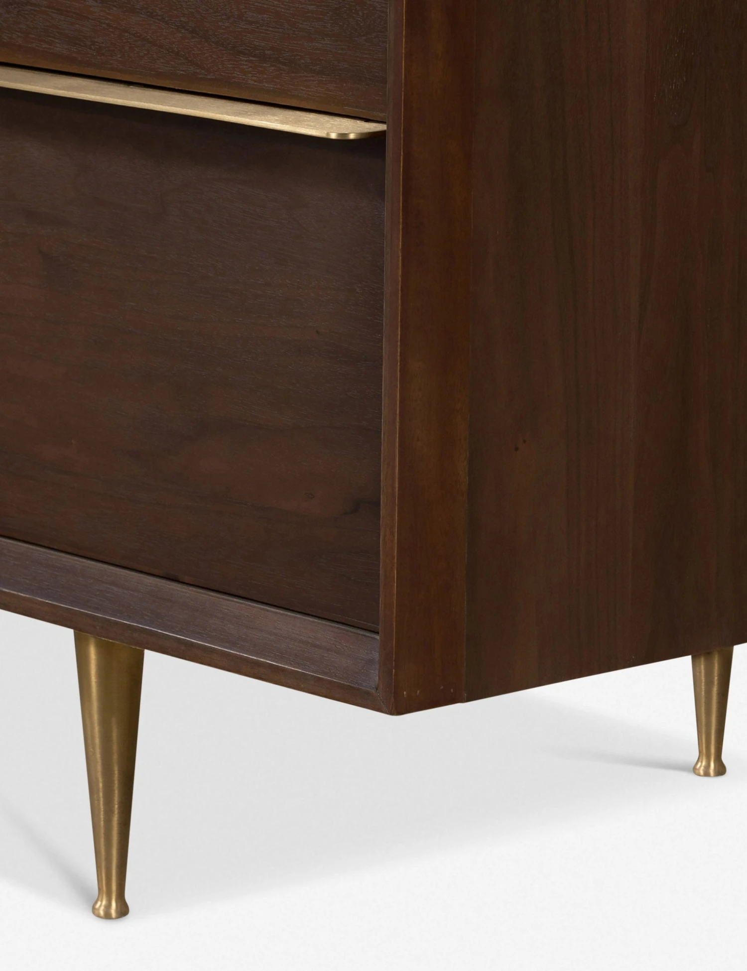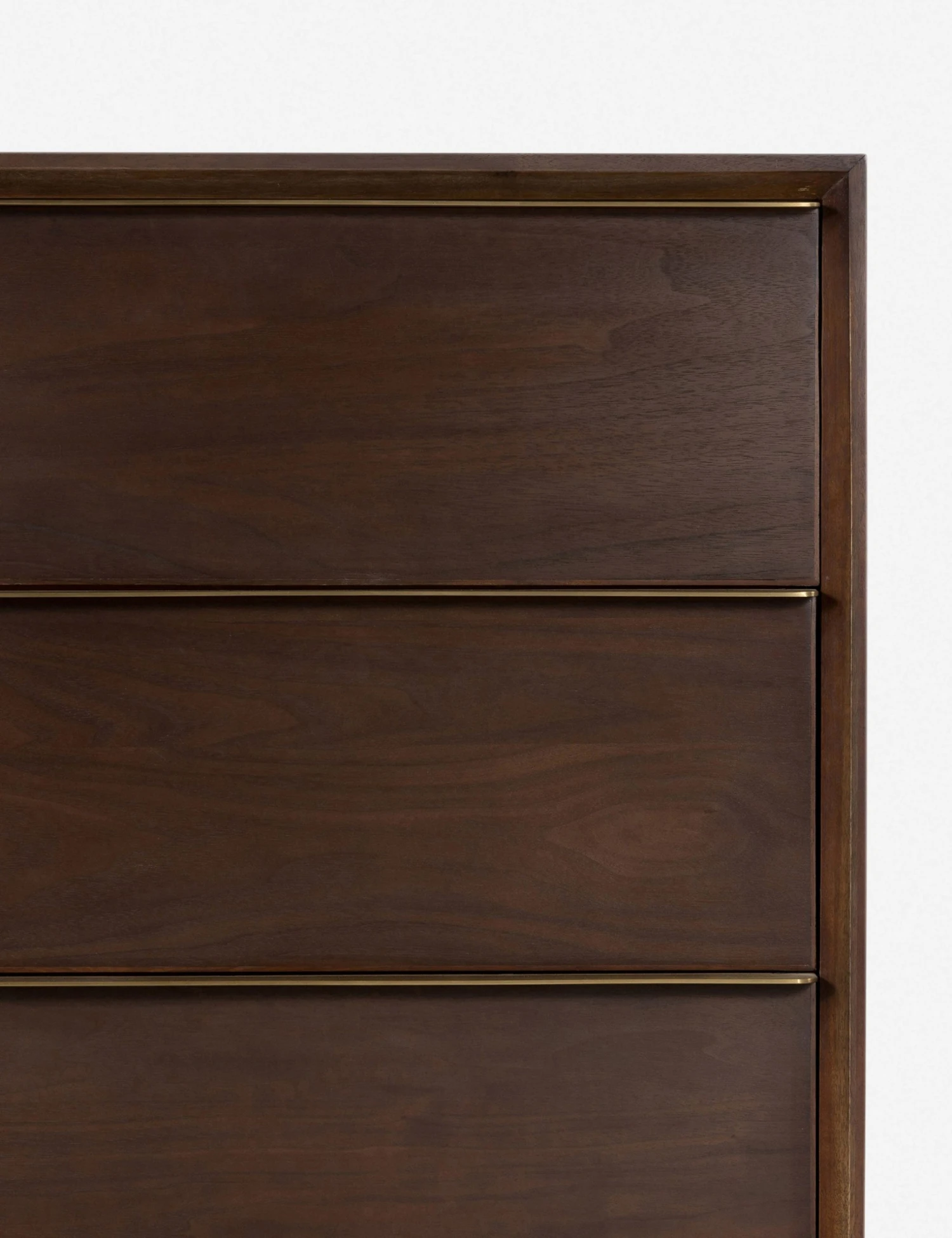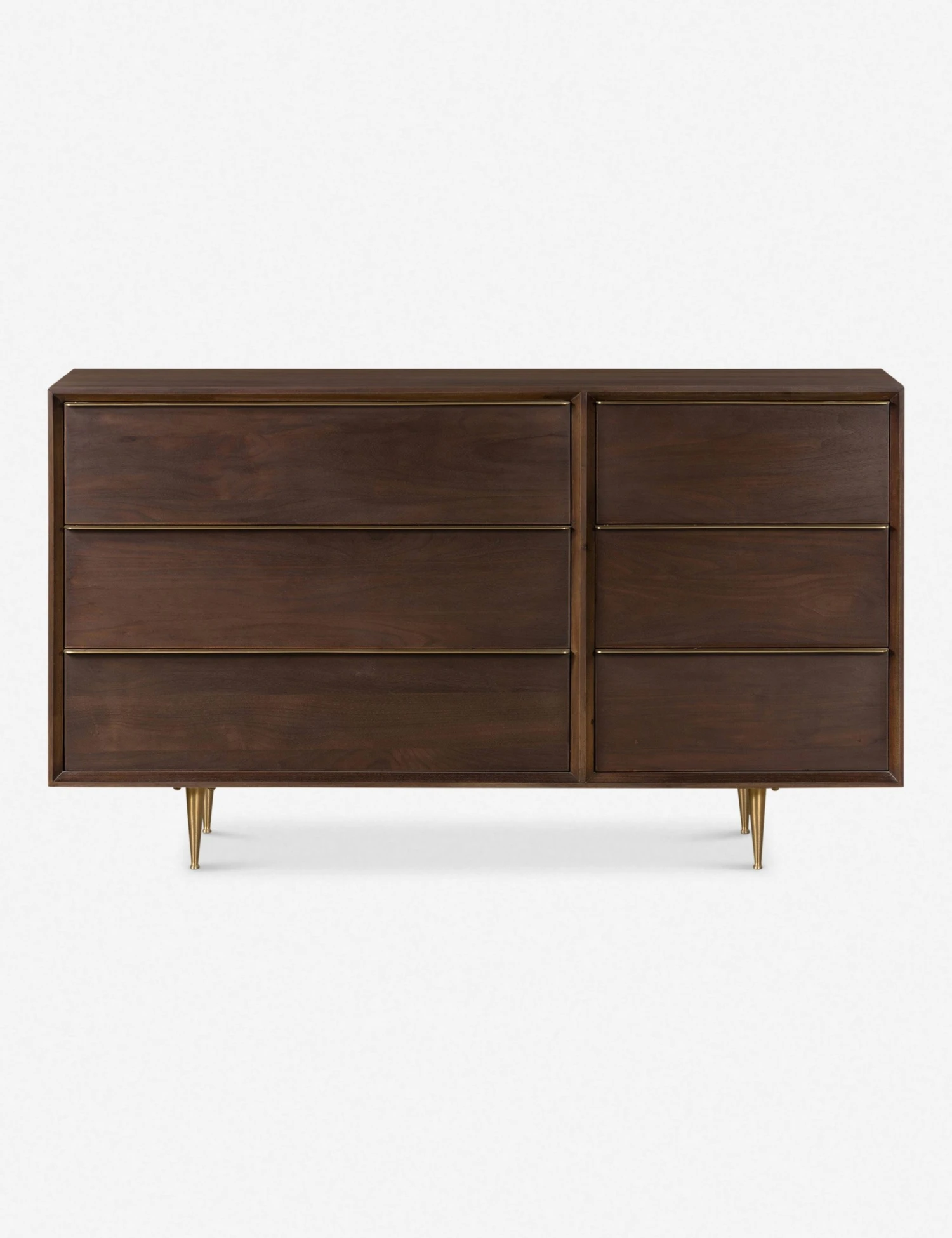 Ground your bedroom or morning space with the understated beauty of this spacious six-drawer dresser. A clean, streamlined design with modern undertones is clad in a walnut veneer with a dark chocolate finish, then fitted with brass-polished drawer pulls and legs for a lustrous accent.