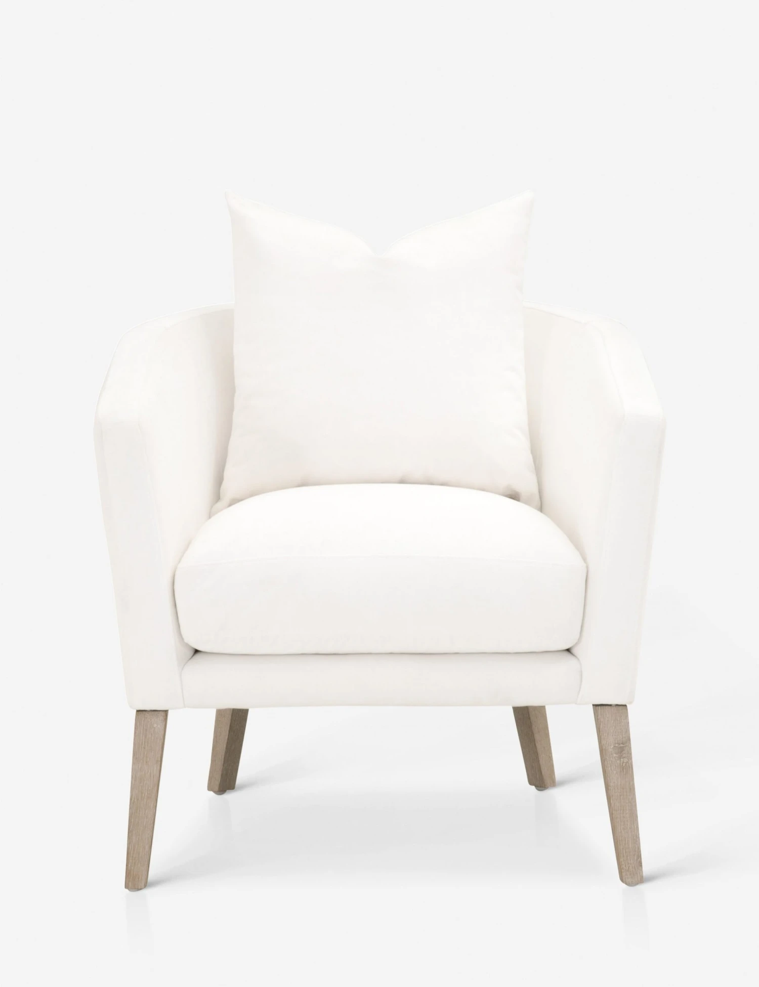 A clean, minimal design gets stylishly paired with maximum comfort for this occasional chair. Its barrel chair silhouette is wrapped in pearl white performance fabric upholstery and features a square throw pillow and solid oak legs. This accent chair offers transitional appeal, easily adapting to different looks.