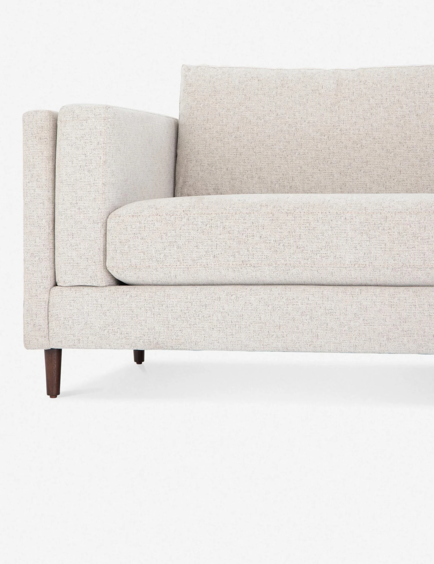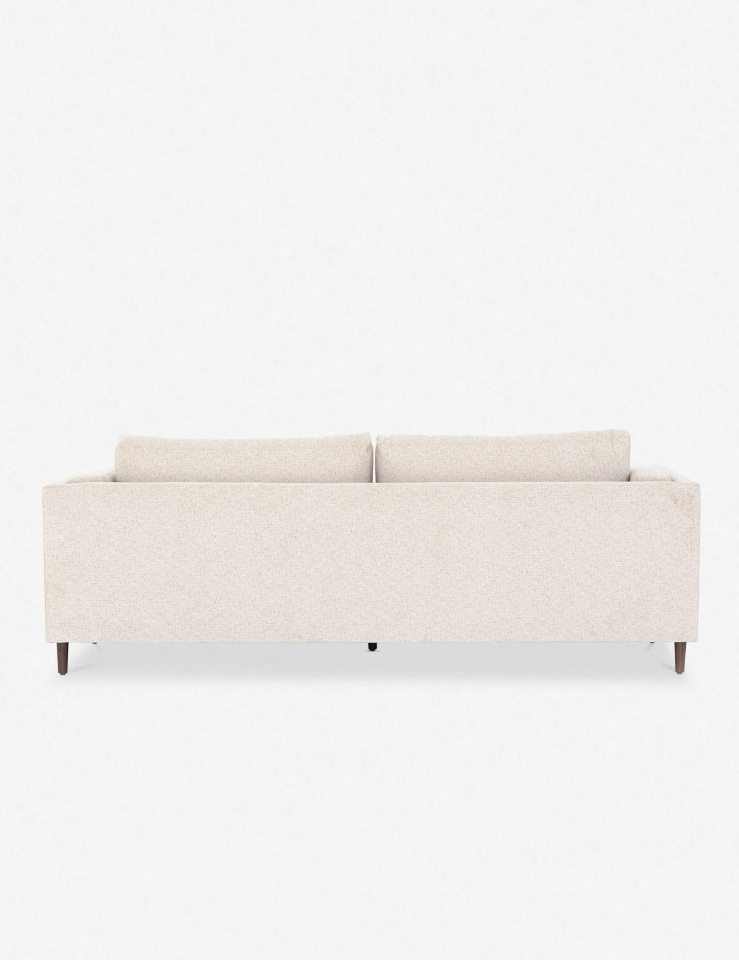 Clean, layered lines inspire a delicate elegance in this dynamic sofa. The tapered, auburn-finished legs offer an airy elevating touch that complements the light-toned, performance-fabric upholstery for a visually light profile that belies a spaciously substantial living room couch.