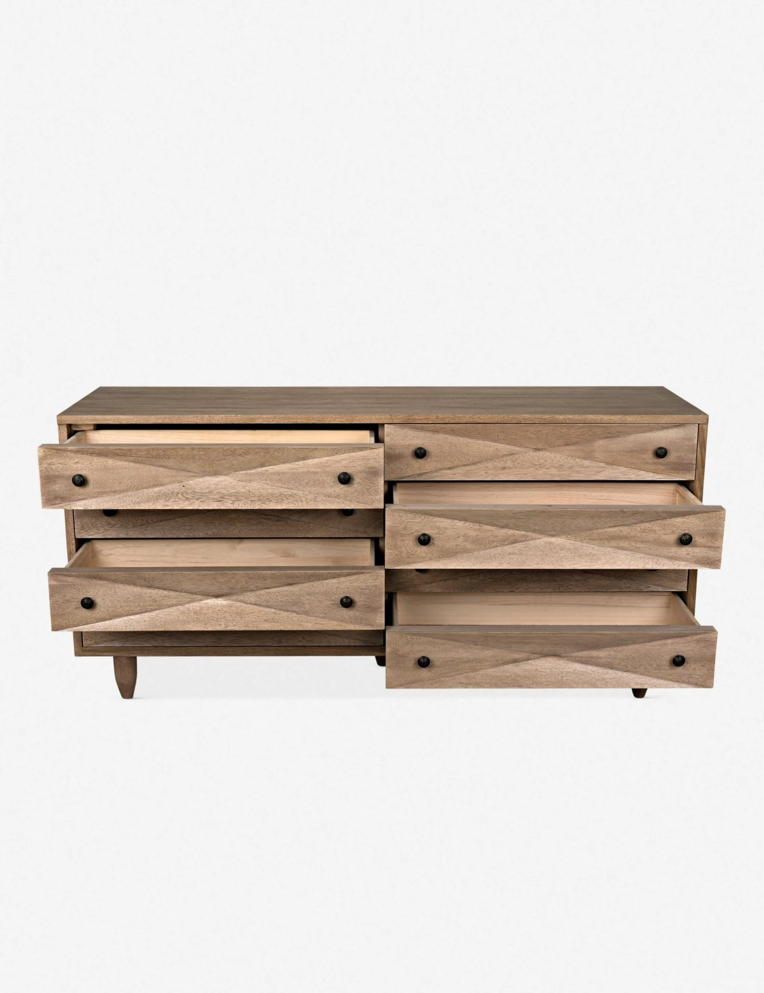 Designed with dimensional diamond-detailed drawers, this double chest is a gorgeous addition to any bedroom. Finished with simple round drawer pulls, we love how the beautiful wood grains stand out on this ultra-versatile storage piece!