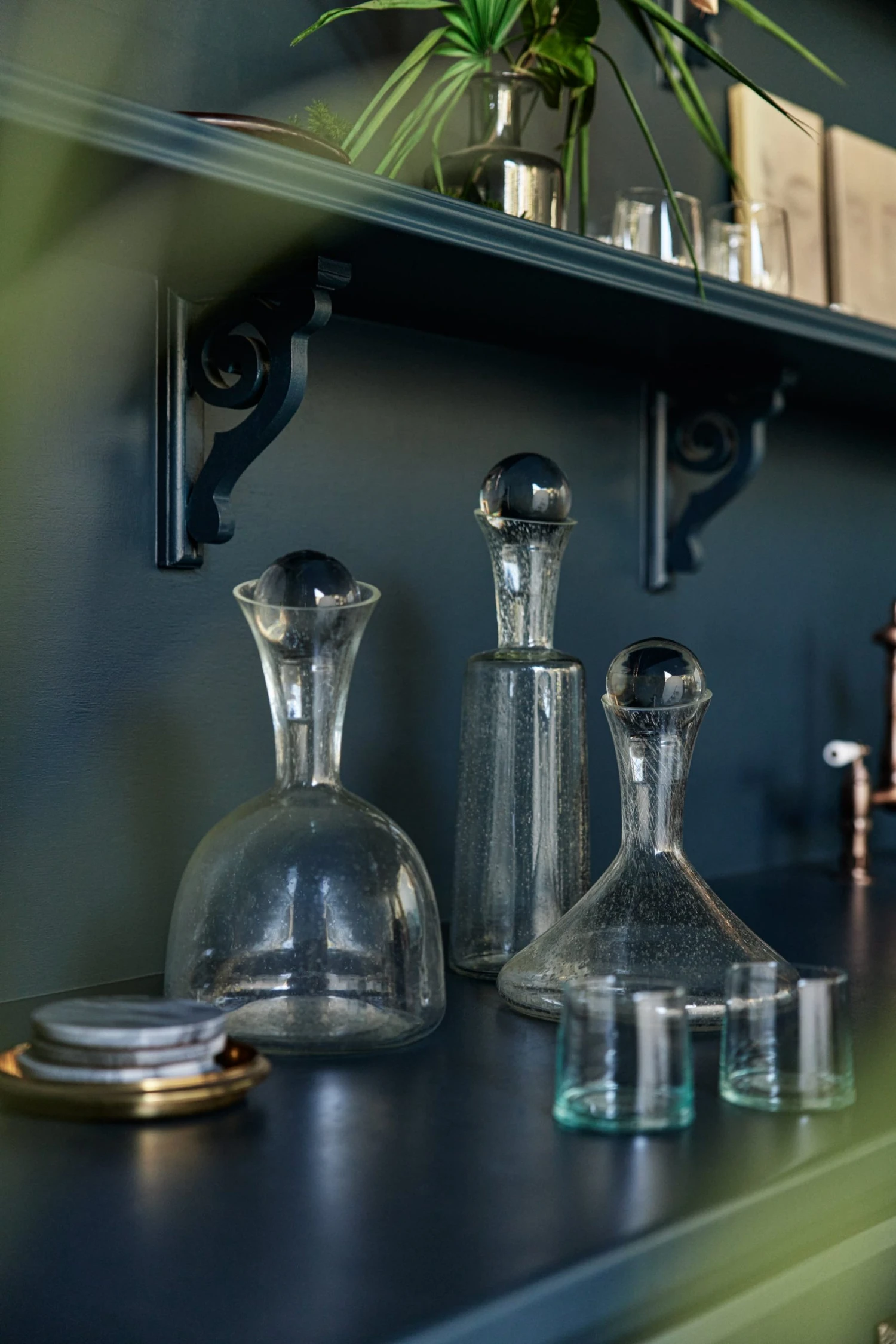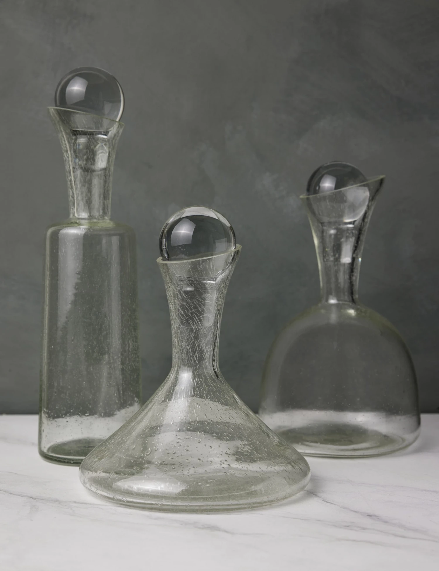 Refine the look of your bar cabinet with this set of glass decanters. Tailored and timeless forms feature a modern edge, with each decanter’s neck chicly cut at an angle. Each is topped with a glass globe stopper for a striking geometric contrast.
