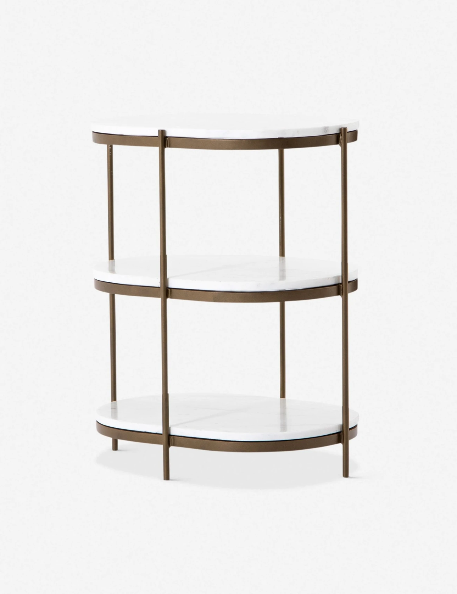 Boasting both vintage-inspired charm and a dose of modern luxury, this three-tiered nightstand is the perfect finishing touch to your feminine-chic bedroom. While the brass-finished iron has an industrial look, white marble and soft oval-shaped shelves soften the look for a stunning storage piece you’ll love!
