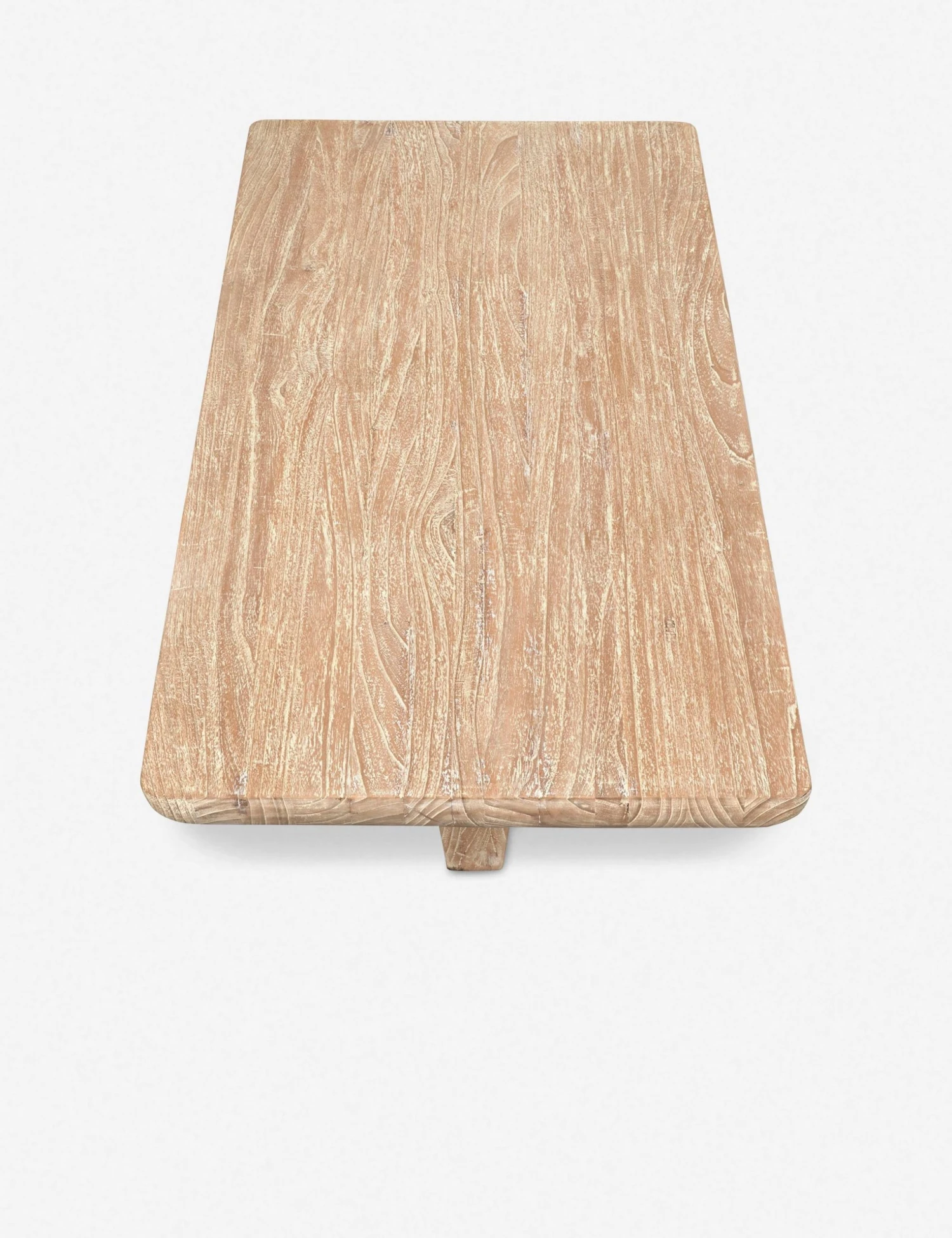 With its sculptural base and weathered look, this wood coffee table is a statement maker for your living room. Crafted from solid Mindi wood, its rough-hewn finish adds rustic appeal to a space. Style this coffee table with a plush vintage rug for tons of organic texture.