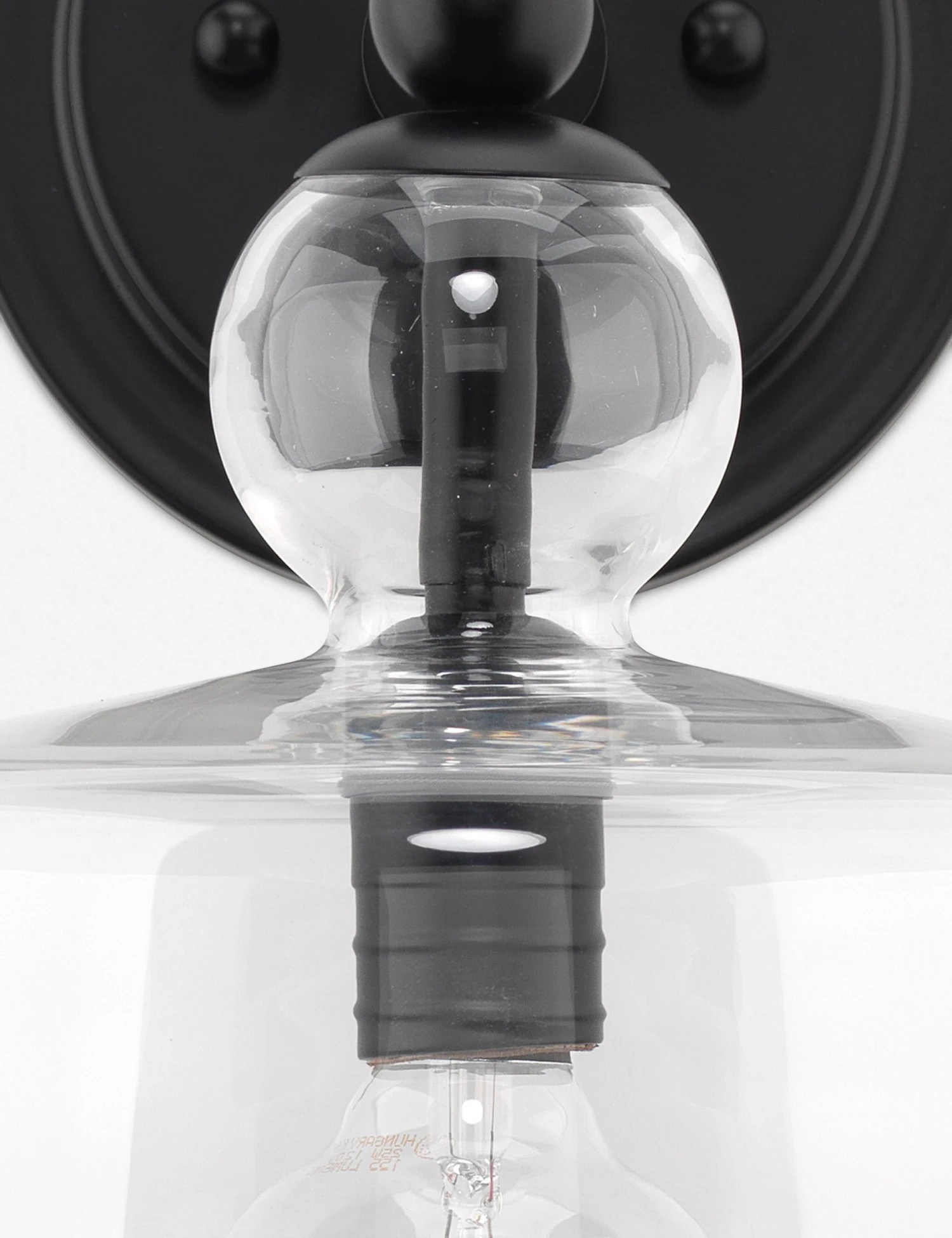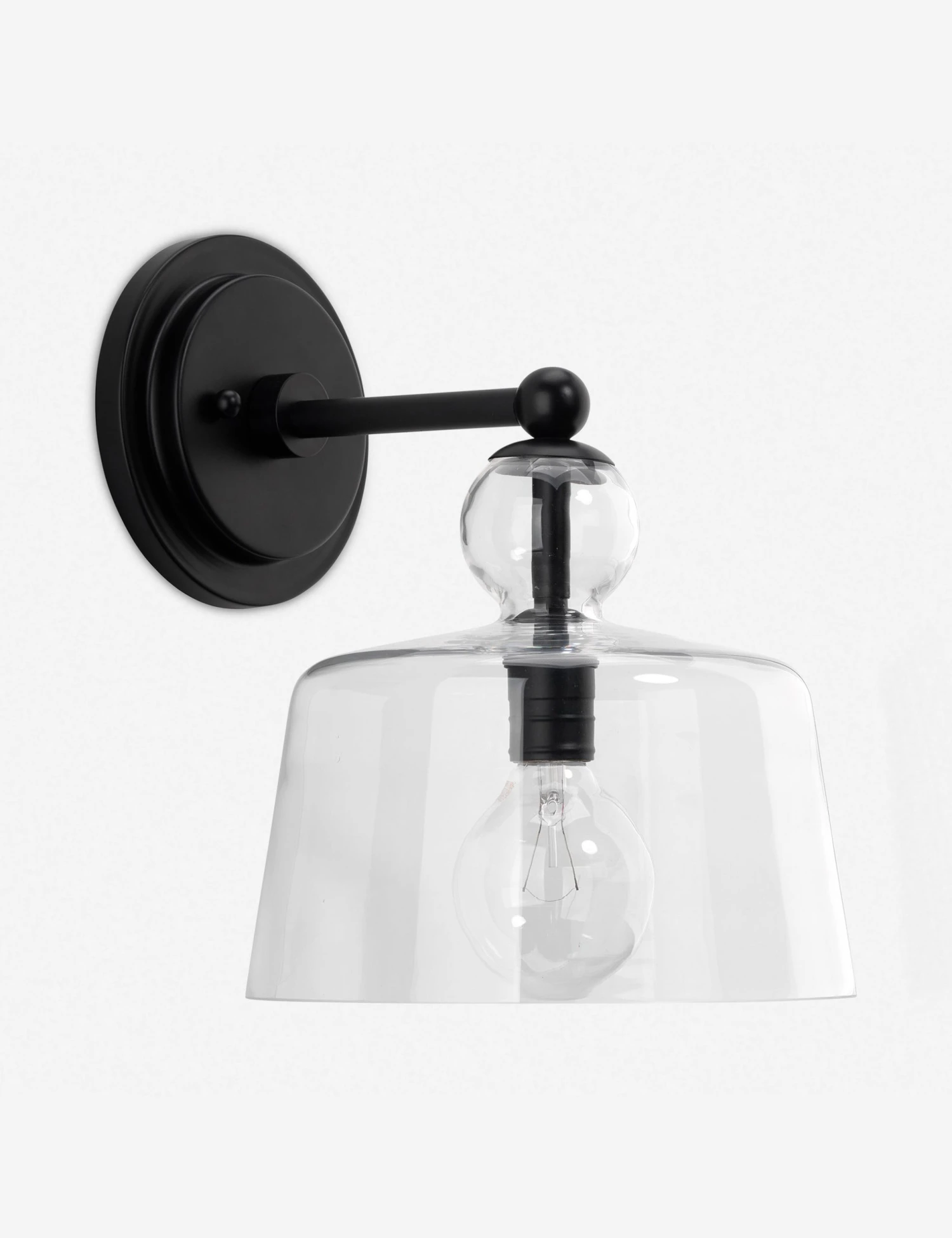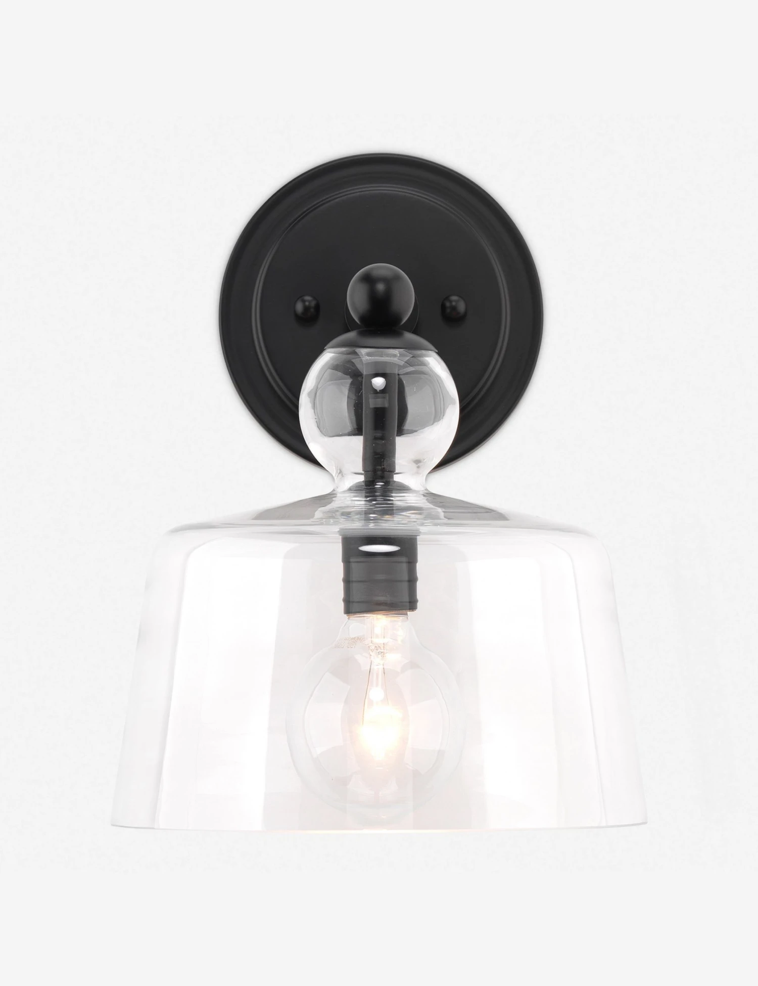 A glass bell jar shade is fitted with iron hardware, finished to suit your look, for a streamlined sconce design that will add a polished touch to your decor. Style this wall sconce as an uplight, downlight, or horizontally for a lighting scheme tailored to your space.