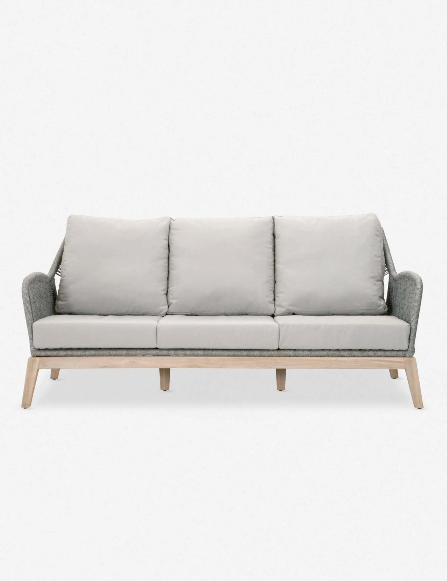 This sofa offers a contemporary twist on outdoor living with an intricate crisscross rope weave on a classic light teak frame. Plush, removable cushions complete the look for added textural contrast – and a super comfy way to relax!