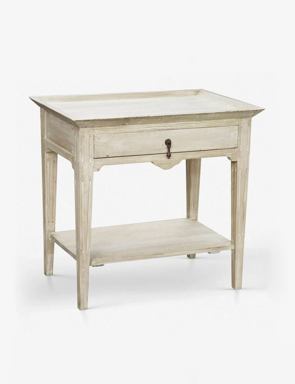 intricate carving and delicately tapered legs lend this nightstand a glamorous and feminine air. The light washed wood and teardrop drawer pull have plenty of antique charm, and the lower shelf provides plenty of extra storage.