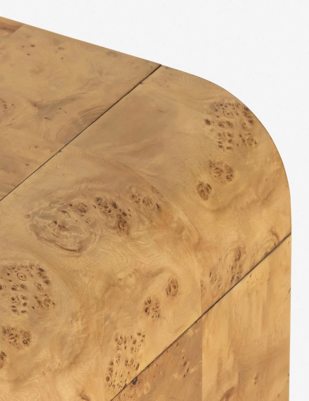 Clad in a patchwork burl wood veneer, this sleek coffee table offers your space a signature look. The curving waterfall design features a high polish finish highlighting its luxe natural grain. We love the seamless silhouette and warm tone this wood coffee table offers looks from deco to modern.