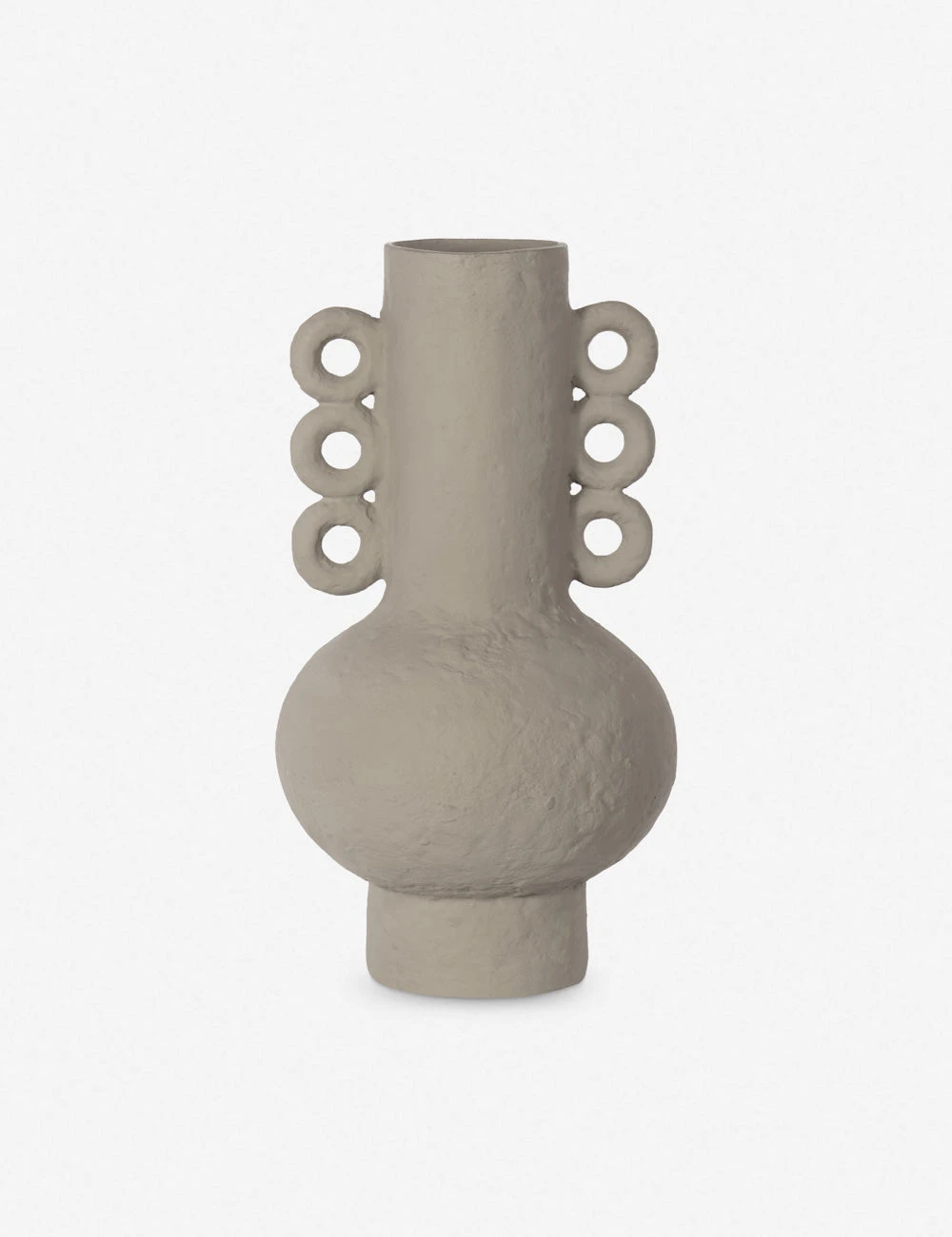 Playing on classic pottery designs, the Chandra Metal Vase features a clean silhouette and looping handle element in a beautiful grounding tone. The matte finish and dimpled texture highlight this metal vase’s soft sculptural lines, striking a balance between antique and modern for transitional appeal.