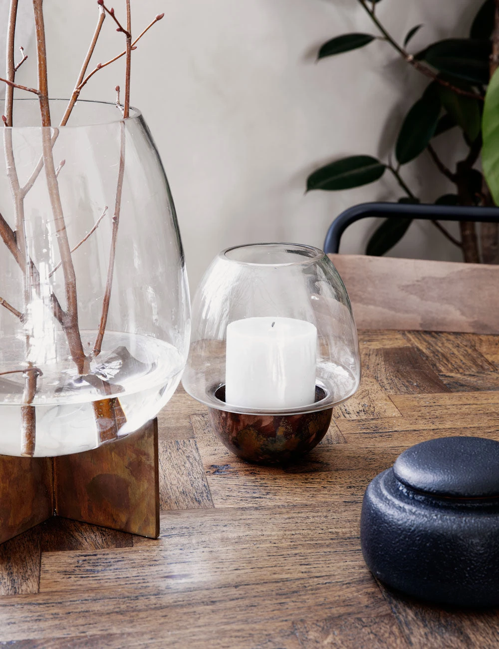 We love the blend of simplicity and charm this candle stand offers on an entryway or coffee table. The combination of sleek glass and raw iron will accent your look with inviting warmth.
