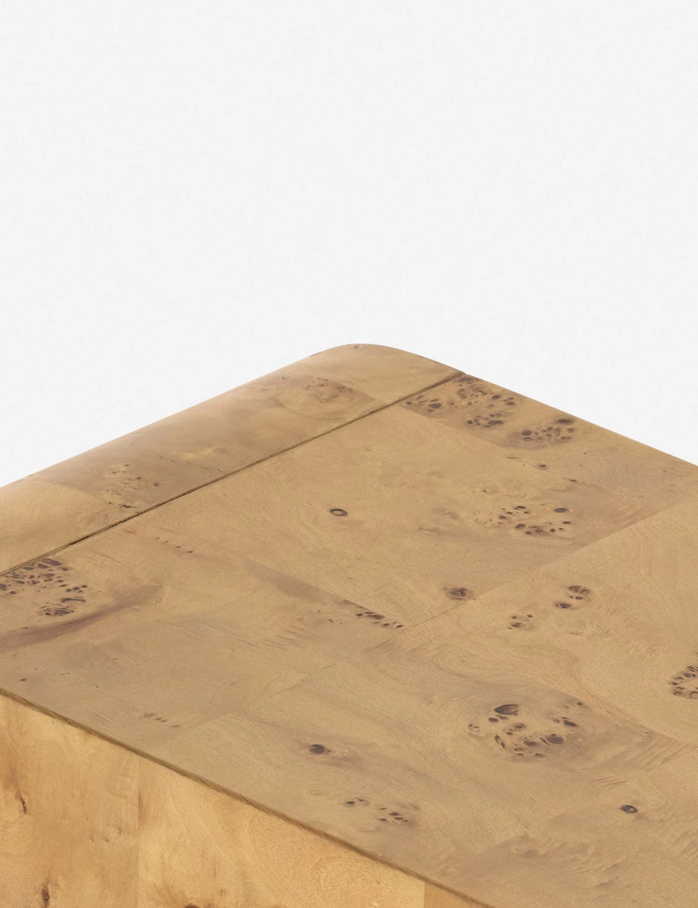 Clad in a patchwork burl wood veneer, this sleek console table offers your space a signature look. The curving waterfall design features a high polish finish highlighting its luxe natural grain. We love the warm elevating tone for a grand, statement-making entryway table.