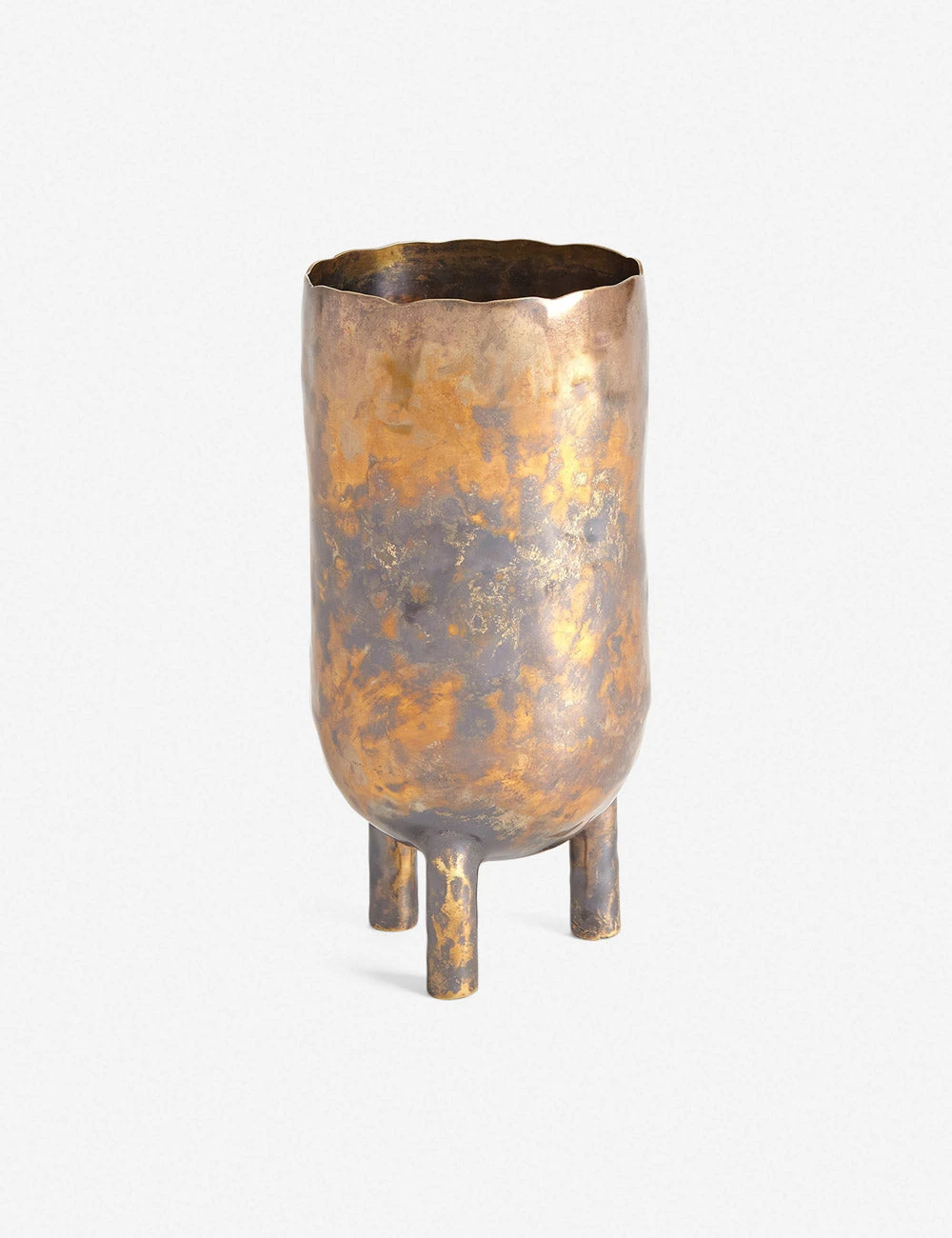 This small decorative container sits on three legs, evoking vintage allure for your desktop, console, or coffee table. The hammered brass is oxidized to give each piece a unique burnt luster. Use it as a catchall for keys, change, or office supplies like pens.