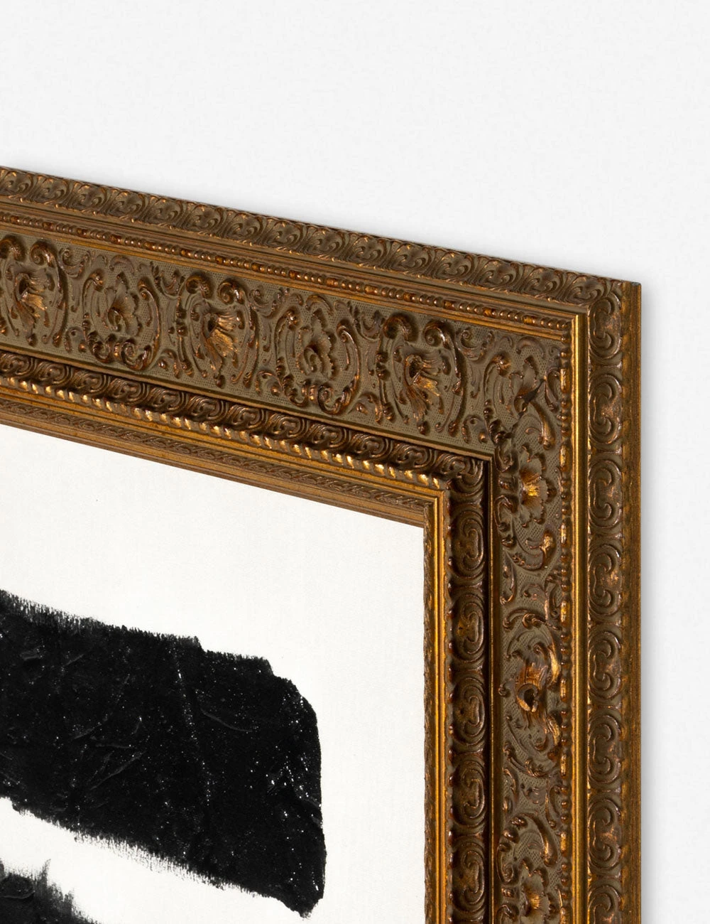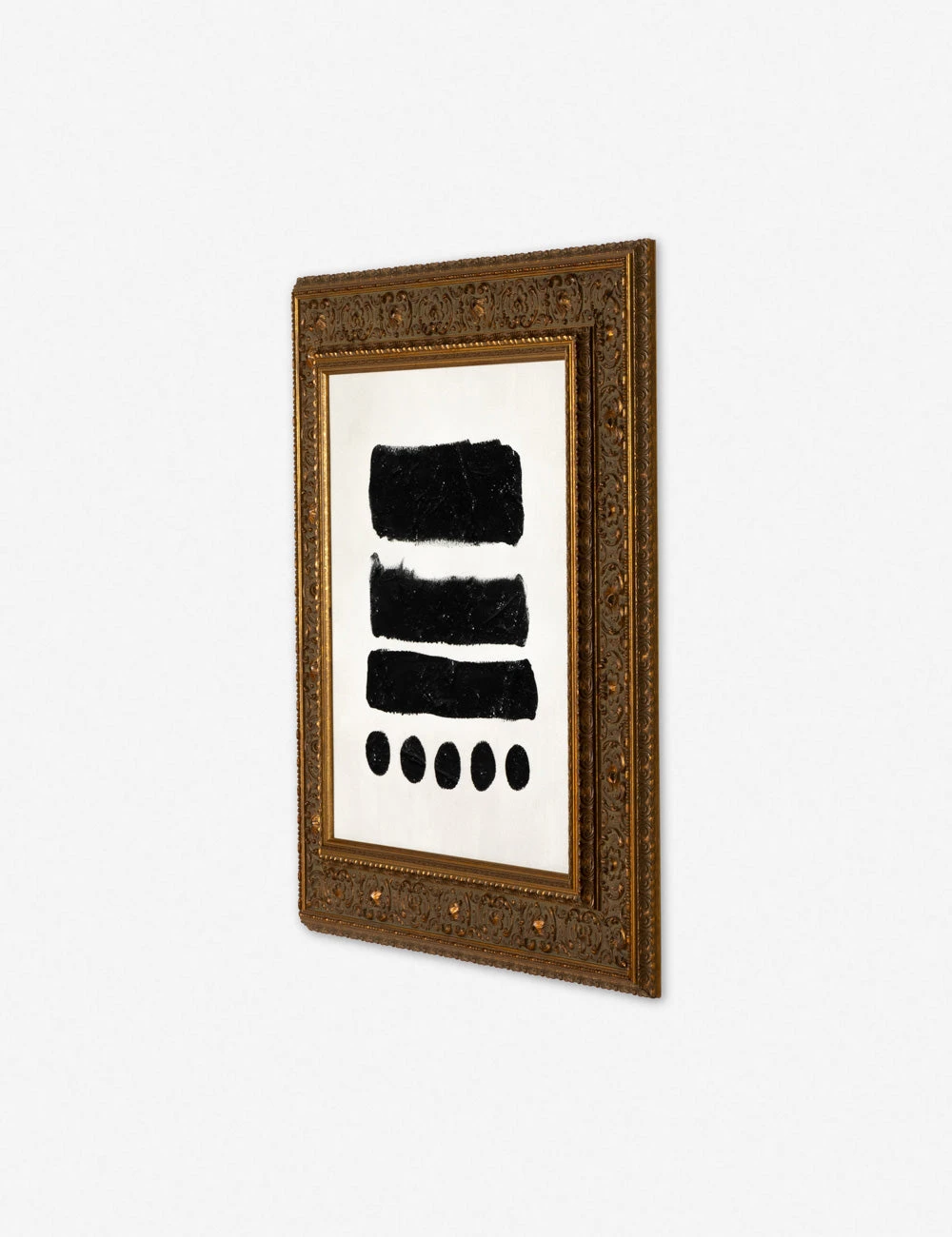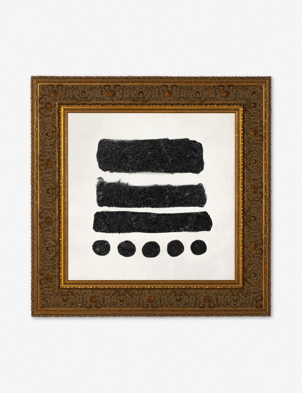 In this striking wall art series, a minimalist composition creates textural allure against a matte canvas. The ornate gold frame underscores the distinctive character of the piece, offering a signature element for richly collected wall decor.