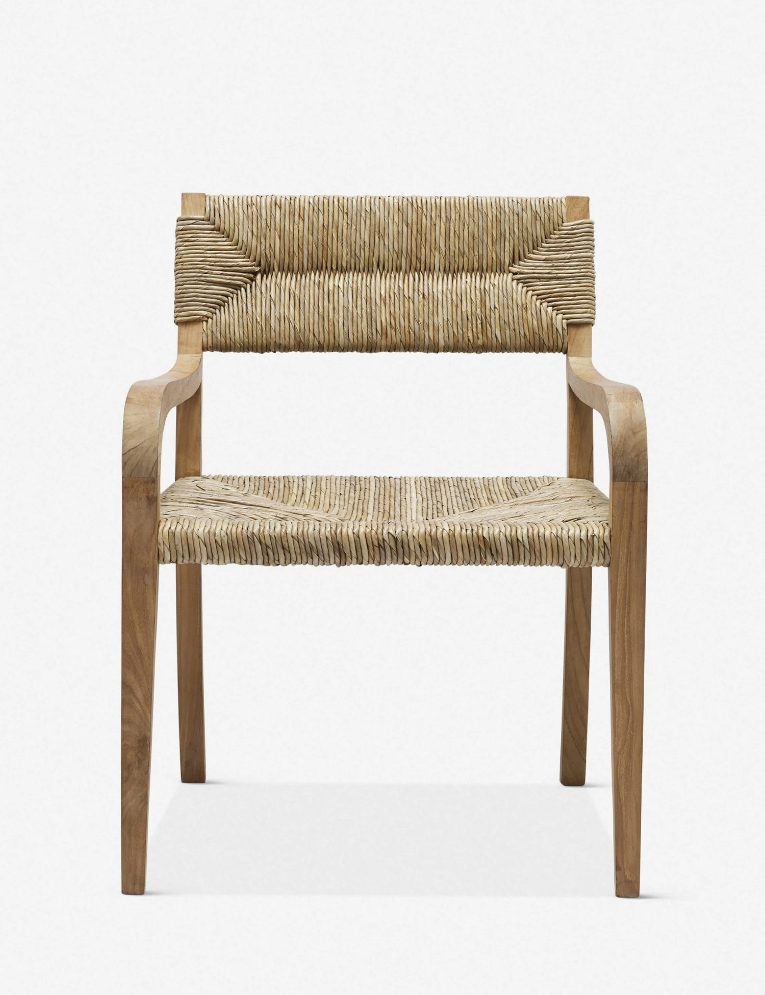 Sculptural curved teak arms give this chair a modern edge, while the thickly woven seagrass rush back and seat keep the tone natural and easy. We love to use it as dining room chair in a neutral space, or as a single statement kitchen chair pulled up to your built-in desk.