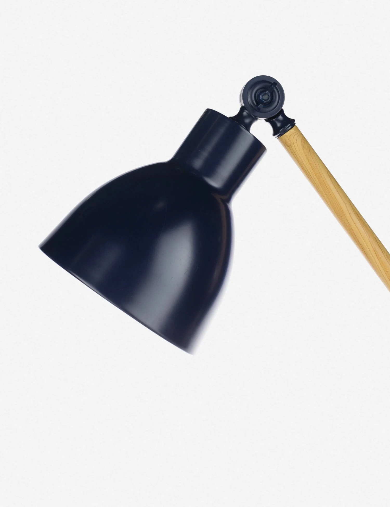 The Norma table lamp is a unique spin on the classic. Featuring a metal base and shade in dark navy, a natural body that has the appearance of wood provides a stark stylistic contrast. Adjustable at the base, top, and middle for customized lighting positioning.