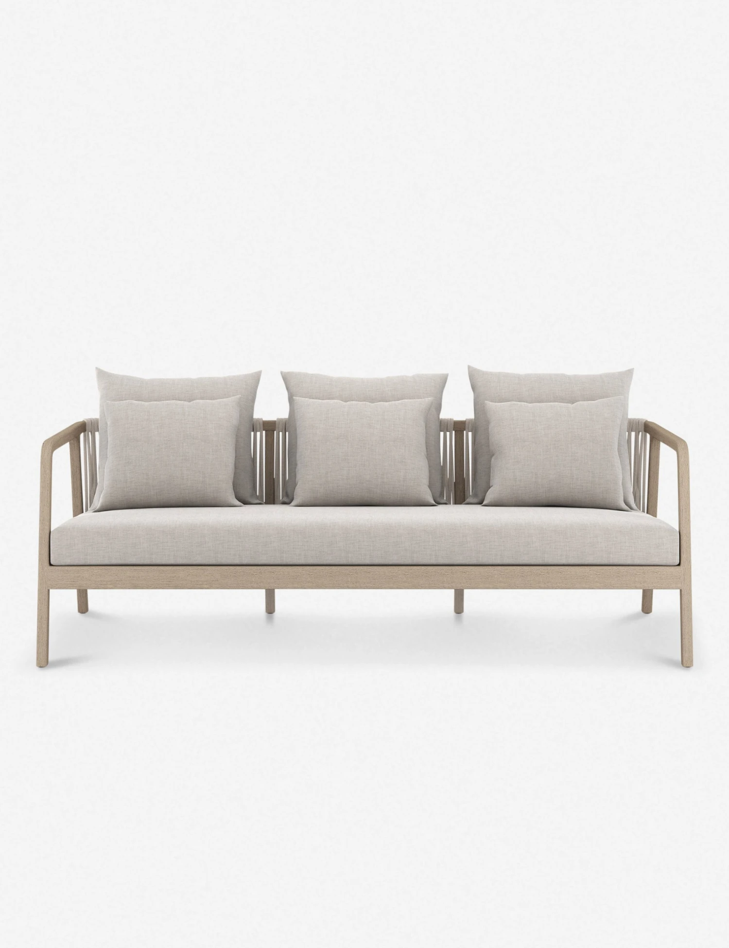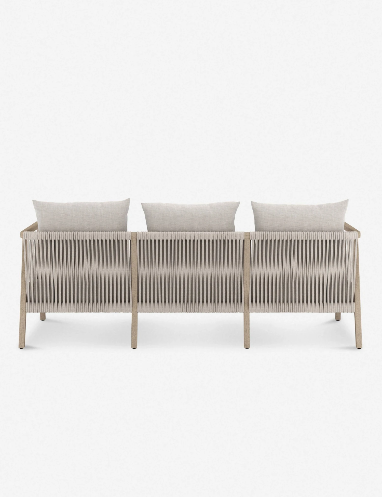 A streamlined design features an airy frame with sculptural lines in this transitional couch. The woven rope detailing and plush, weather-resistant cushions offer the perfect place to land for fresh-air lounging all year round. Anchor your outdoor space or sunroom with this simply refined sofa.