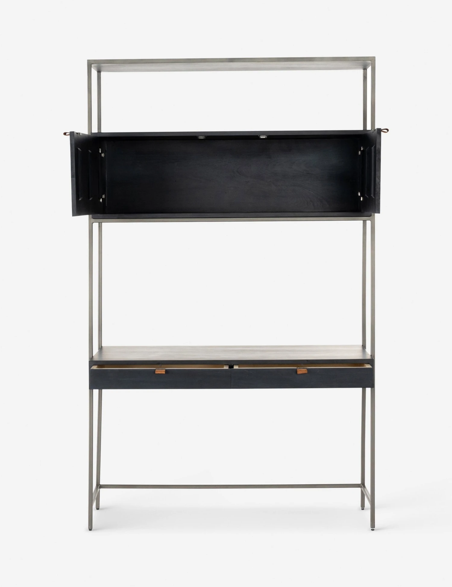 A slim iron frame lends this poplar desk and bookshelves a floating look. Its dark finish, leather pulls, and modern silhouette offer a sleek desk space with plenty of surfaces and storage that can be decked with luxe decor and accents or left sparse for a touch of mid-century minimalism.