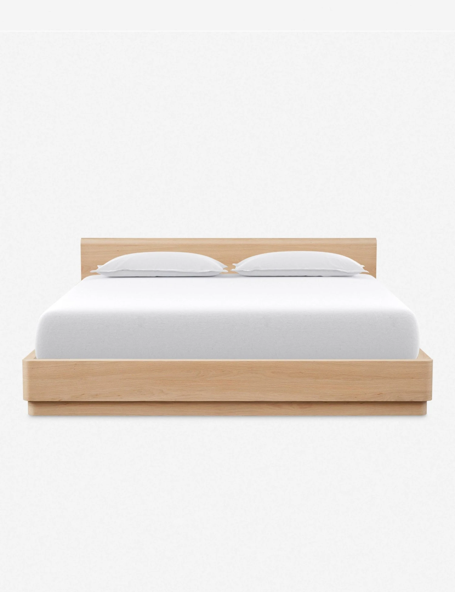 A beautiful platform bed from the Ryland Collection featuring solid oak construction with softly molded corners and a low-slung design. Clean, gentle lines and sleek wood grain are highlighted by a light, natural finish for a look that is understated and refined. This plinth base bed frame with headboard offers a sturdy silhouette that will ground your bedroom with a modern tone.