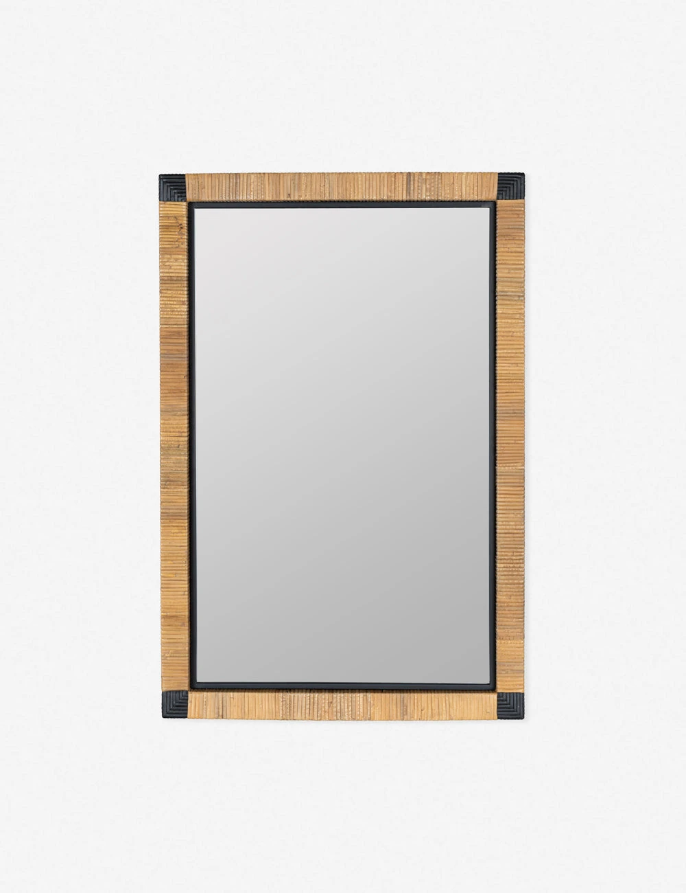 An eye-catching design strikes a balance of texture and tone in this decorative wall mirror. The rattan frame offers natural warmth while black corner accents create a touch of contrast. Style this mirror for a casually refined look in your entryway or living space.