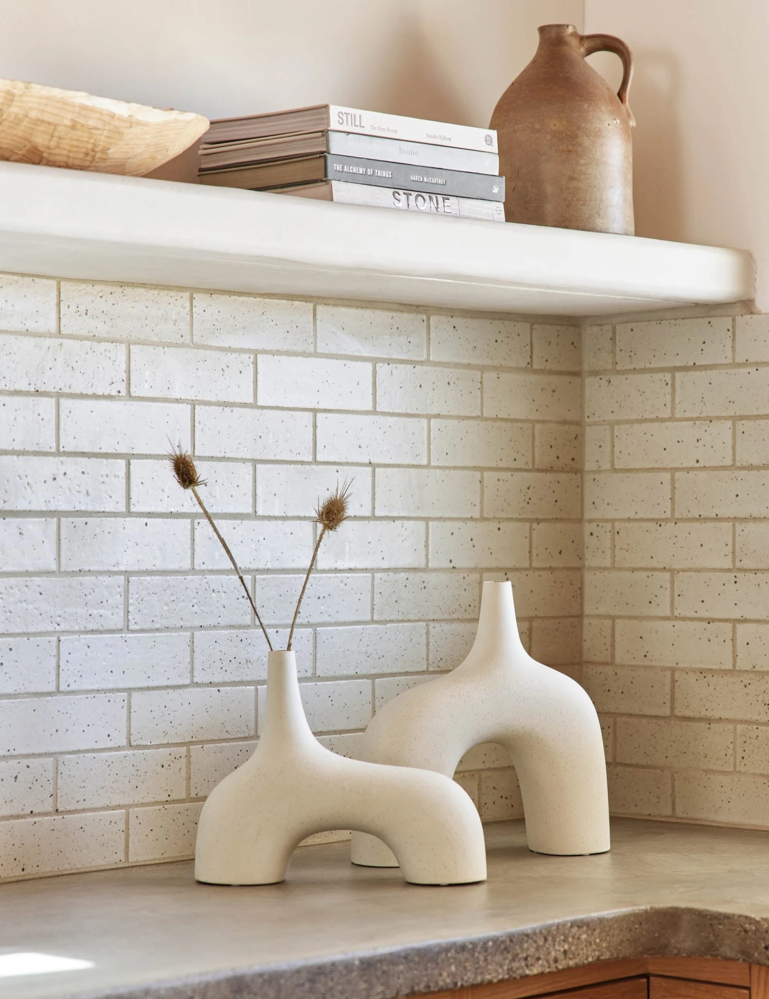 In a chic matte white glaze, this arched vase features a sculptural and creative design which lets you nest it with its coordinating vase. Handcrafted by Portuguese artisans, this ceramic piece’s tactile finish looks great alone or as a nesting duo a coffee table or entryway console.