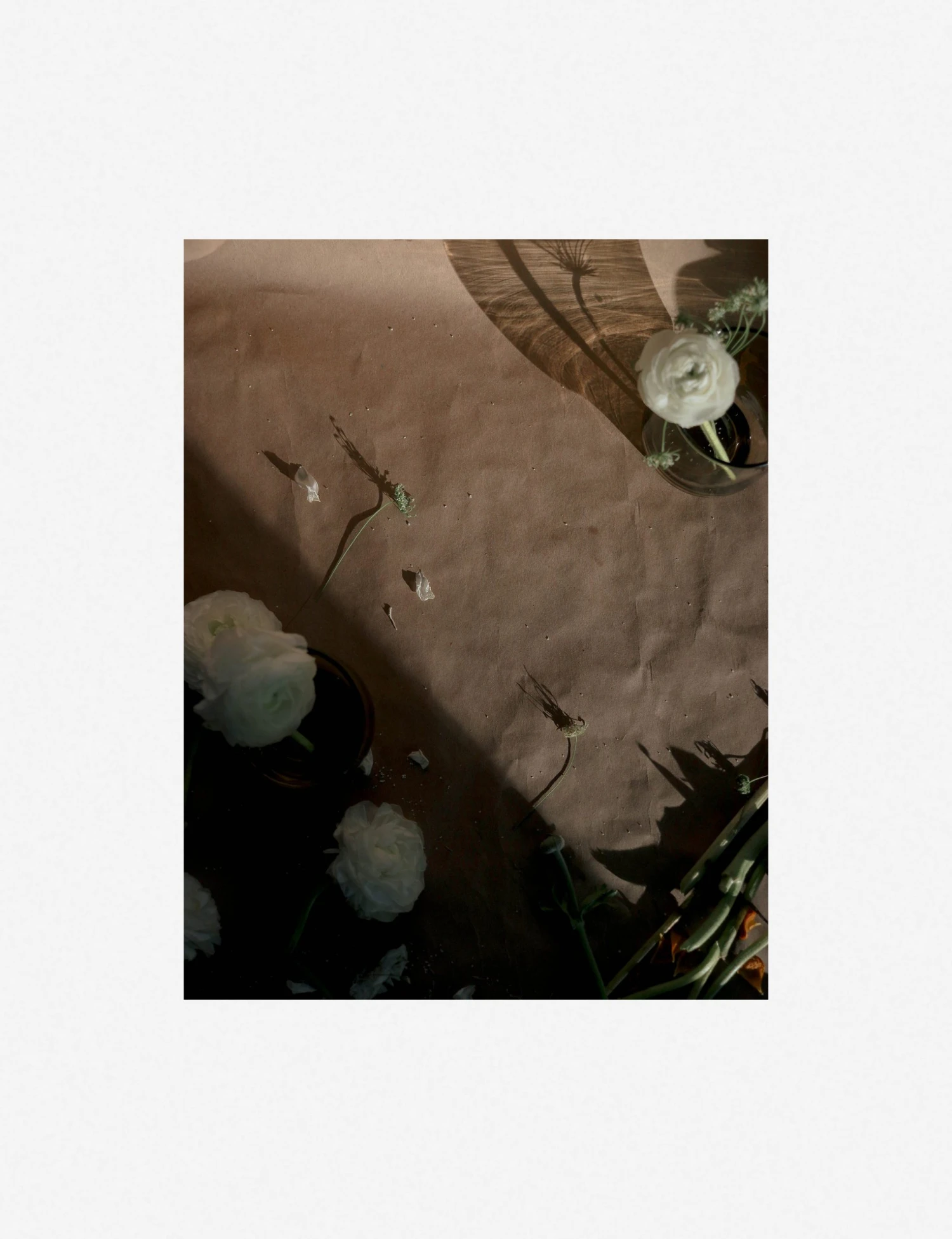 Winston-Salem-based multidisciplinary artist Ashley Johnson uses mixed media to create her staged portraits. Evocative use of negative space defines this still life from a series taken in the deep, stark shadows and warmth of the sunset, marked by strewn petals and vintage tinted glass. This wall art print was produced using archival inks to achieve long-lasting, true-to-color richness, outstanding resolution, and an even ink lay for a stunning gallery-quality addition to your art wall decor.
