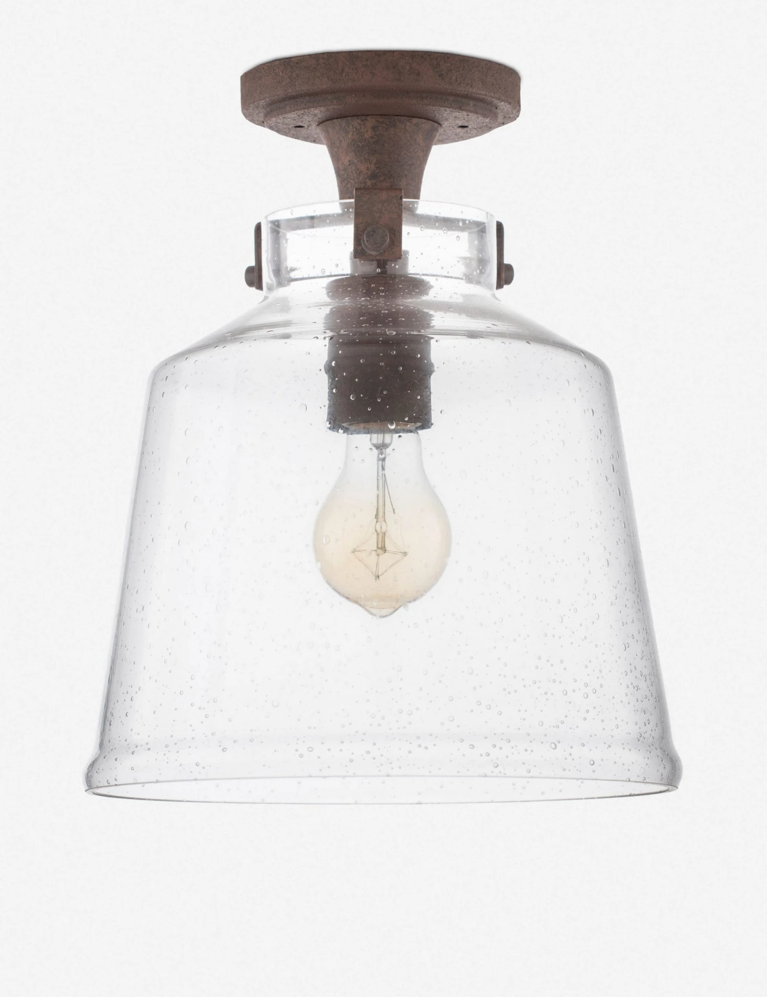 Taking a page from traditional style, this bronzed pendant features a bell-shaped glass shade, complete with bubbles and imperfections to add to the vintage-inspired look.