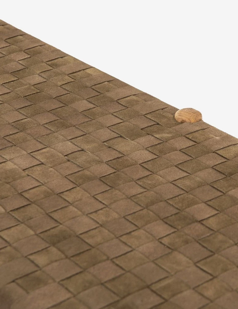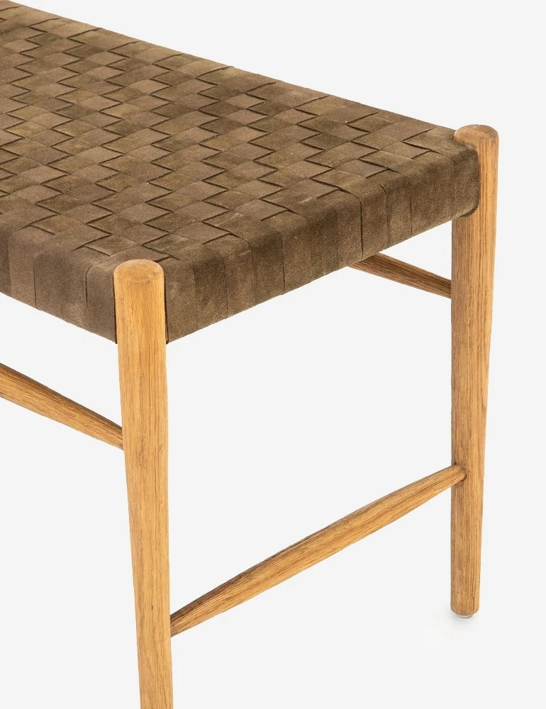 Tapered dowels give this classic bench seating a more modern look, finished in a light oak stain for a dose of natural warmth. The woven leather seat adds contrast in texture and color, and we can’t get enough.