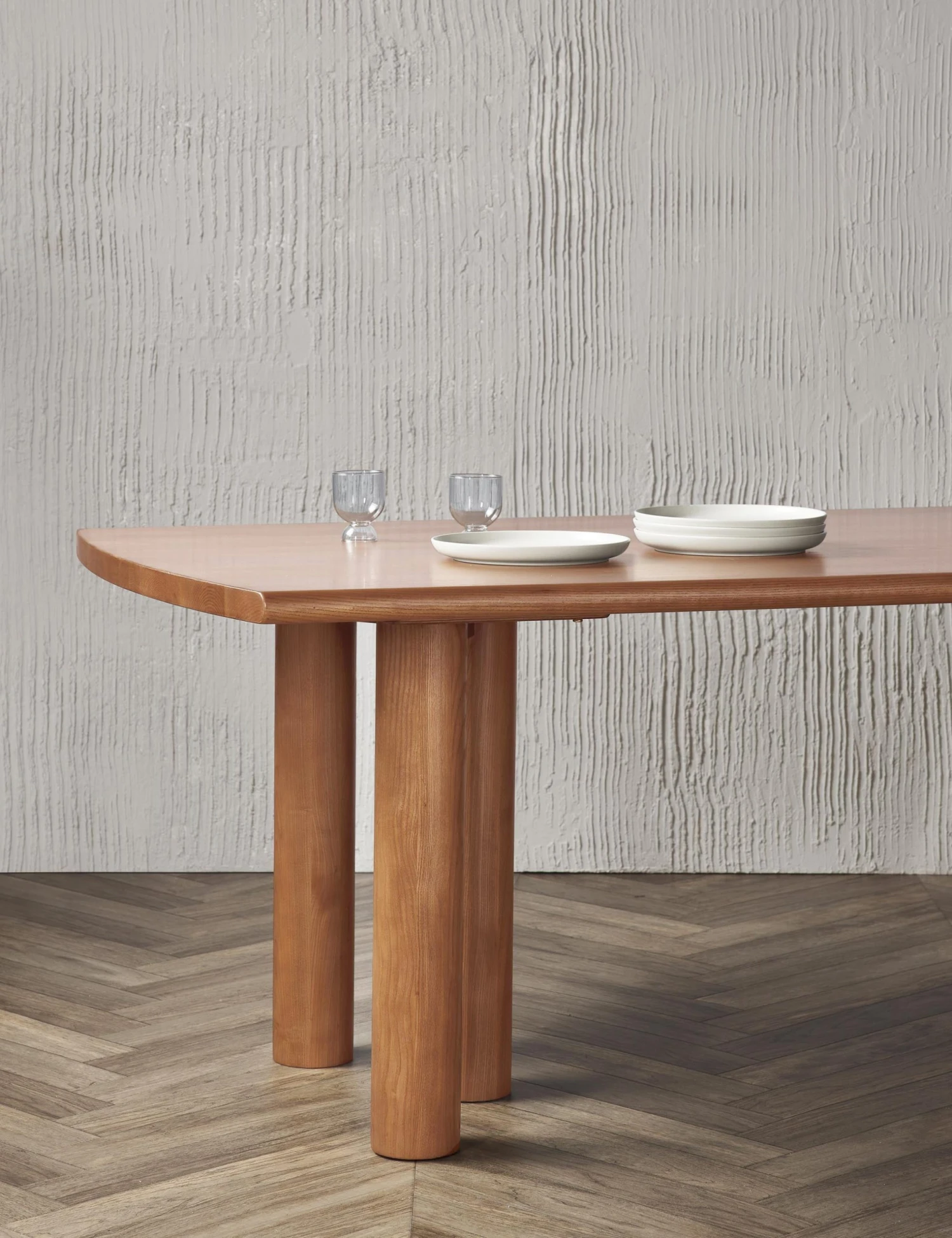 Spread out a feast with this distinctively spacious dining table. Designed with curved edges throughout for sculptural appeal and no hard corners, the six legs provide stability and balance to the columnar form, while its length offers ample room for shared dining. This table is crafted from responsibly harvested solid white ash for a beautiful natural texture rooted in sustainable artisanship.