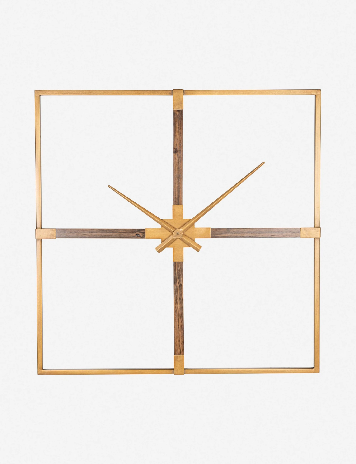A unique square profile is finished in gold with strips of mahogany in this classically inspired clock design. Style this wall clock in a home office or transitional space for an accent that reflects and refreshes traditional design notes.