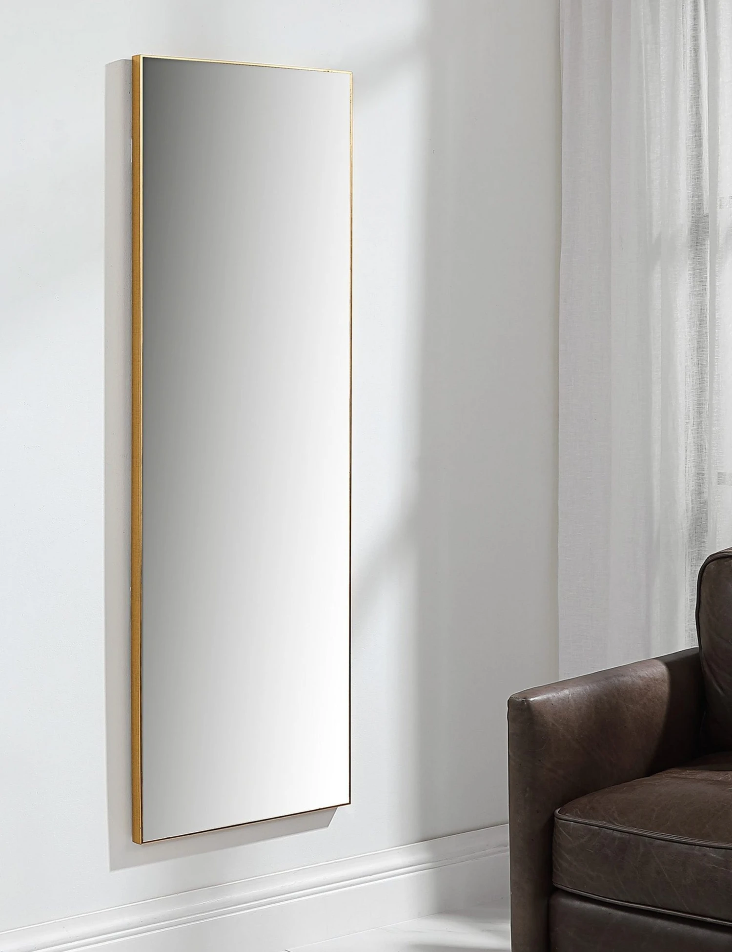 This classic rectangular floor mirror get a contemporary update with slatted cutouts on the curved frame. Lean it against the wall in your bedroom or dining room for an architectural accent piece.