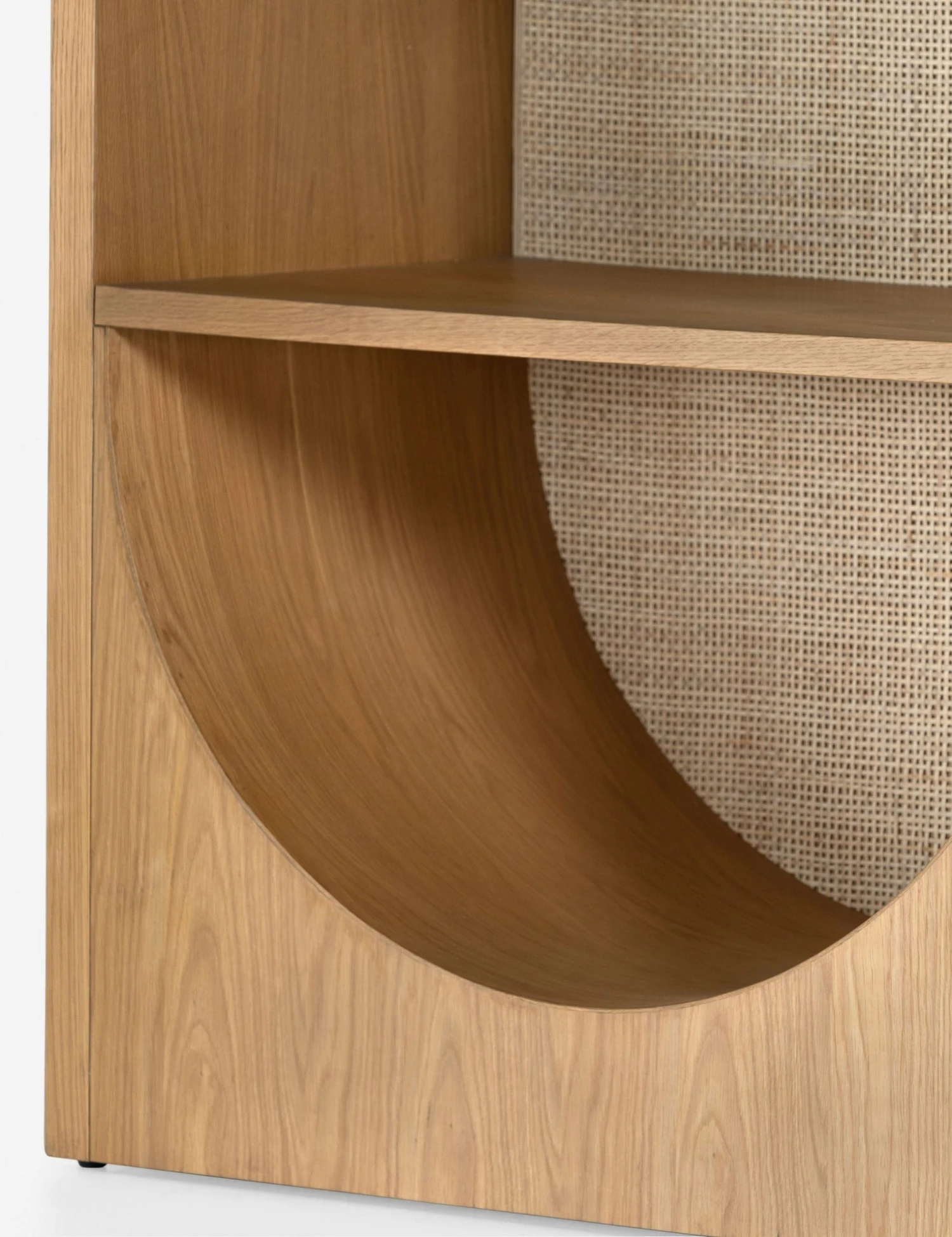 A honey-finished oak veneer and handwoven cane paneling lend warm tones and natural textures to this bookcase. Trim, tailored lines are complemented by an arched accent on the bottom shelf to give this bookcase a playful sense of balance. This fresh design will suit a laid-back, collected aesthetic and offer generous storage with a striking display.