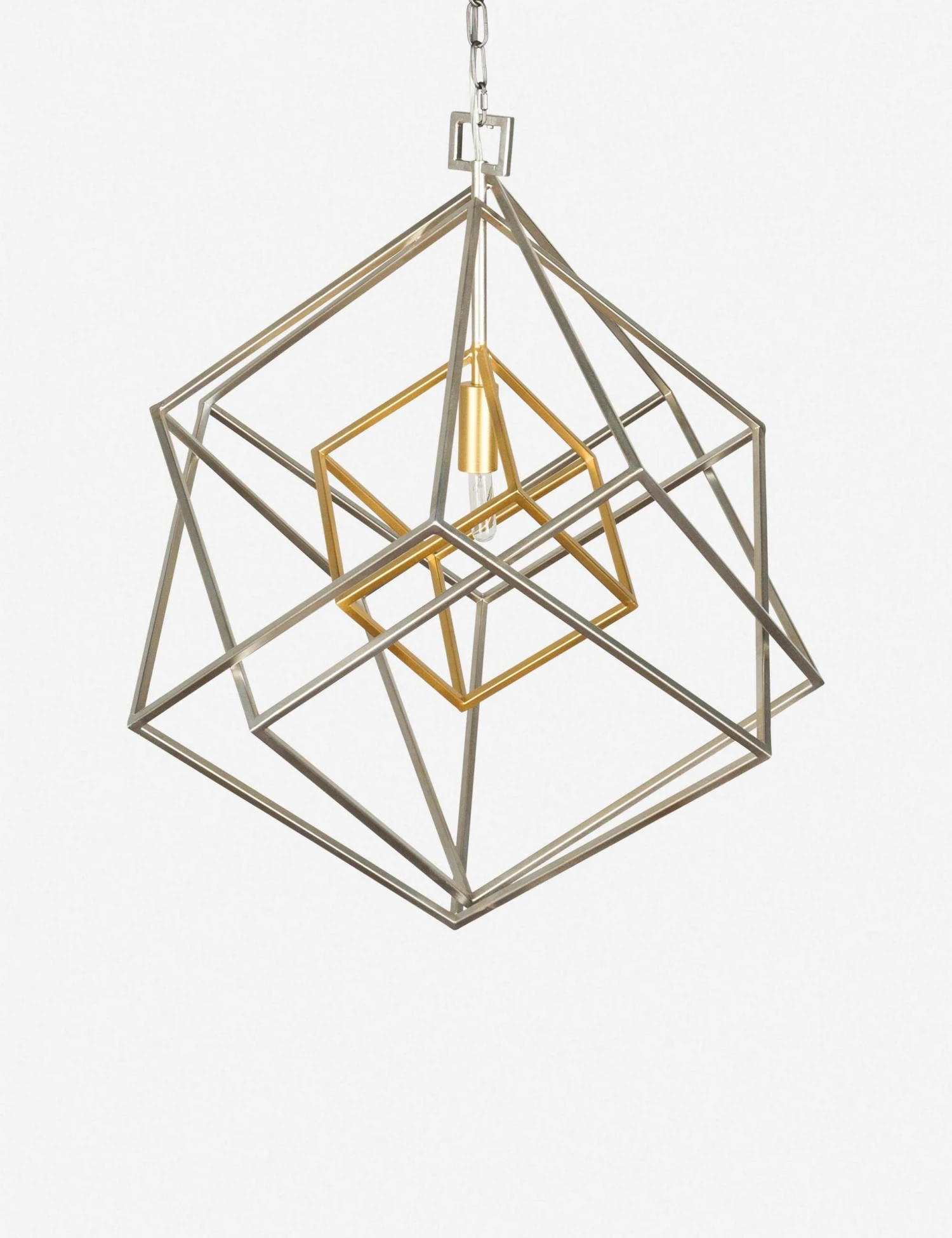 This modern pendant lamp features intertwined cubes in silver and gold finishes, with a single bulb at the center. The geometric design is a sleek statement for your dining room, entryway or high-ceiling living room.